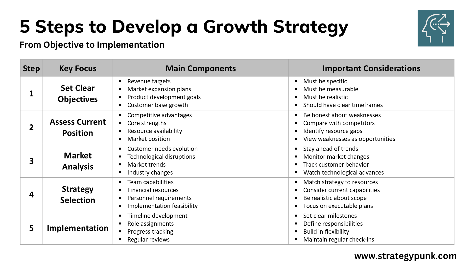 Today, I will break down the five essential steps to help you develop a growth strategy that works—no fluff, just practical steps you can immediately implement.