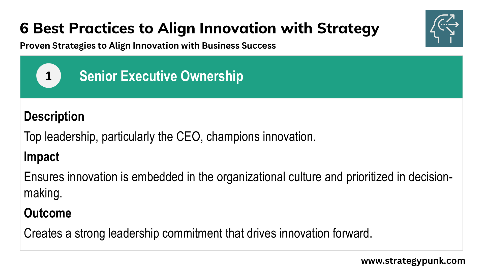 Innovation thrives when supported by senior leadership, such as the CEO. This top-down strategy ensures that innovation is embedded in the organizational culture and receives adequate backing.