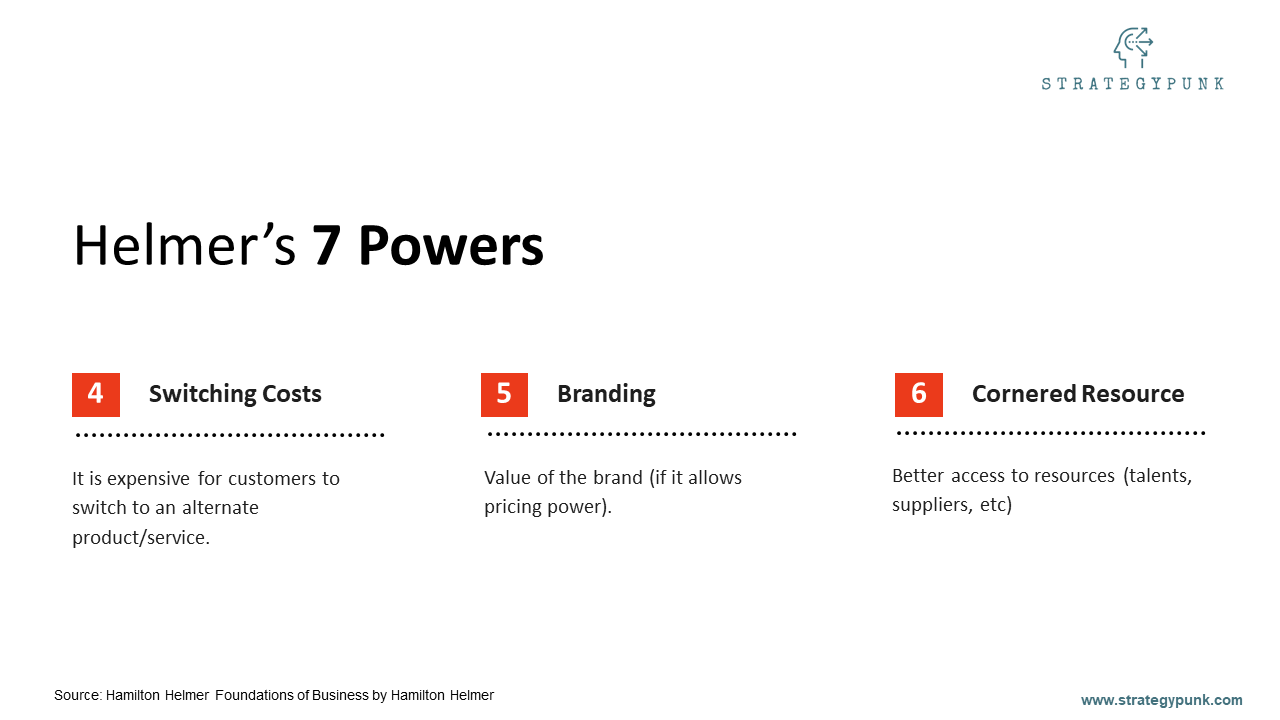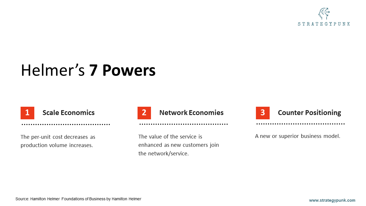 Hamilton Helmer's 7 Powers are Scale Economics, Network Economics, Counterpositioning, Switching Costs, Branding, Cornered Resource, and Process Power.