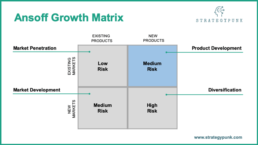 The Ansoff growth matrix helps you understand which products or services you should launch first, second, etc., based on their risk-adjusted profitability.