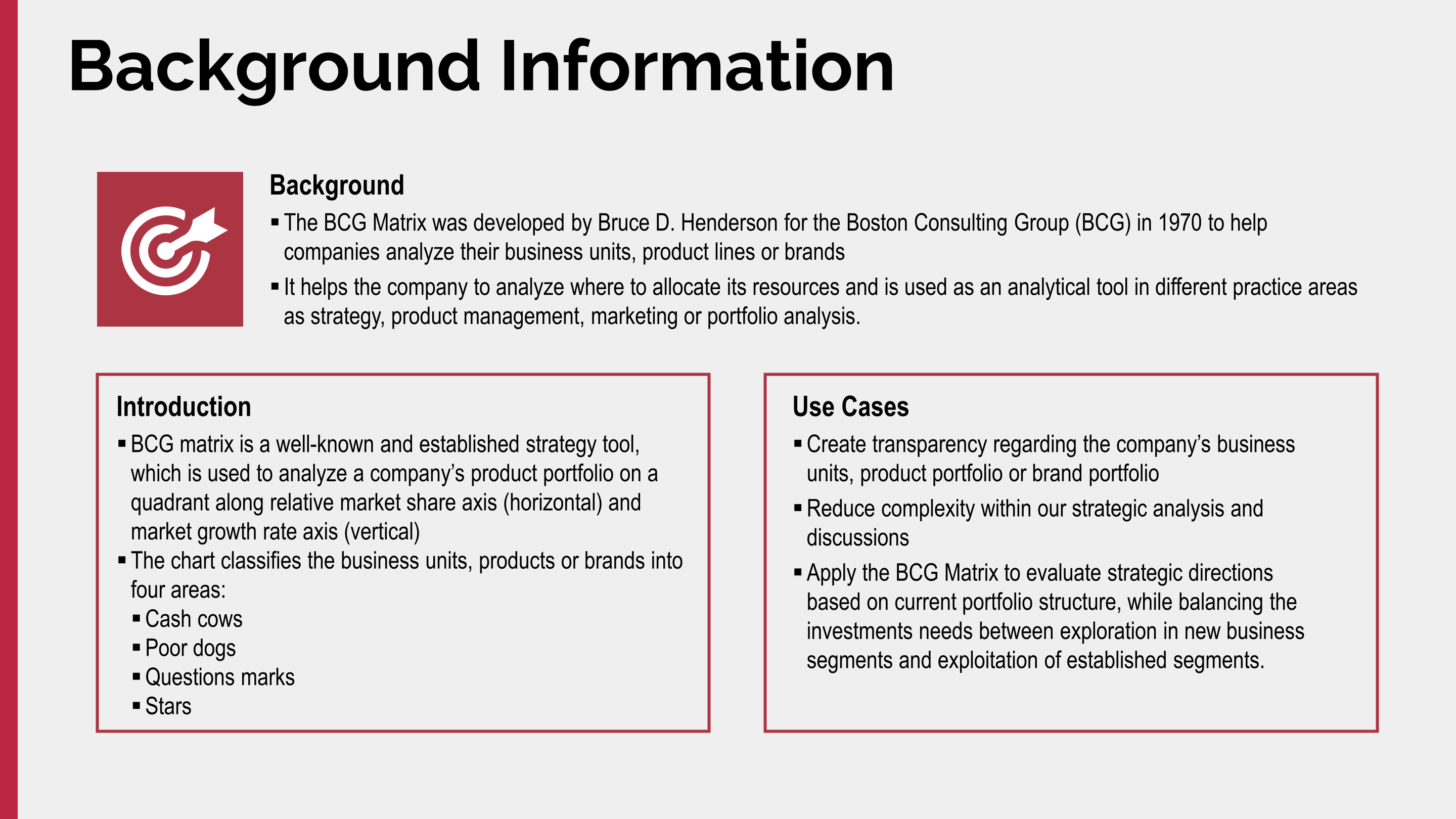Bruce D. Henderson developed the BCG Matrix in 1970 for the Boston Consulting Group (BCG)to help companies analyze their business units, product lines, or brands.