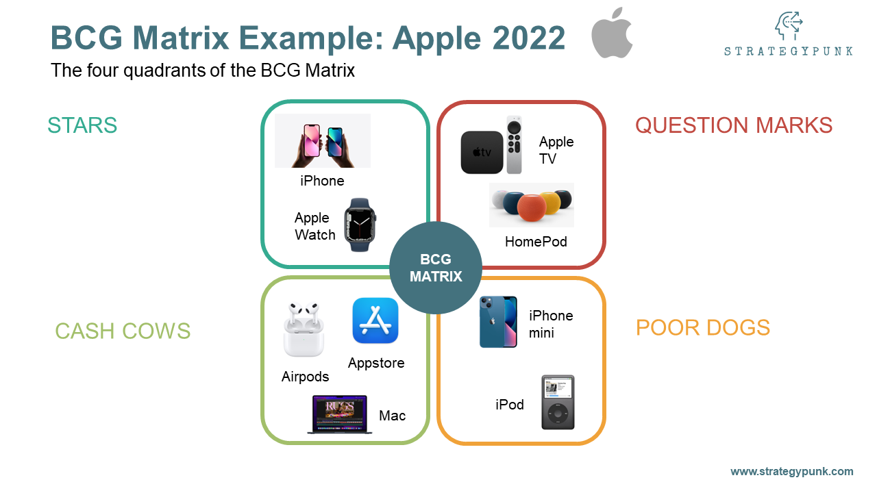 Consider the following BCG matrix example for an organization like Apple. Apple offers a wide range of products and services, from iPhones and Macs to the Apple Music subscription service.