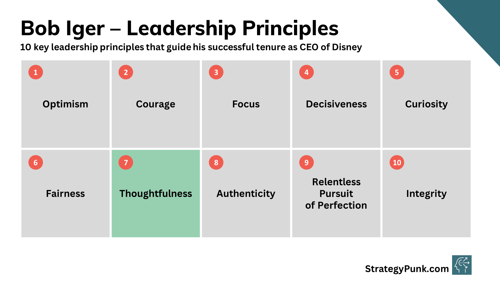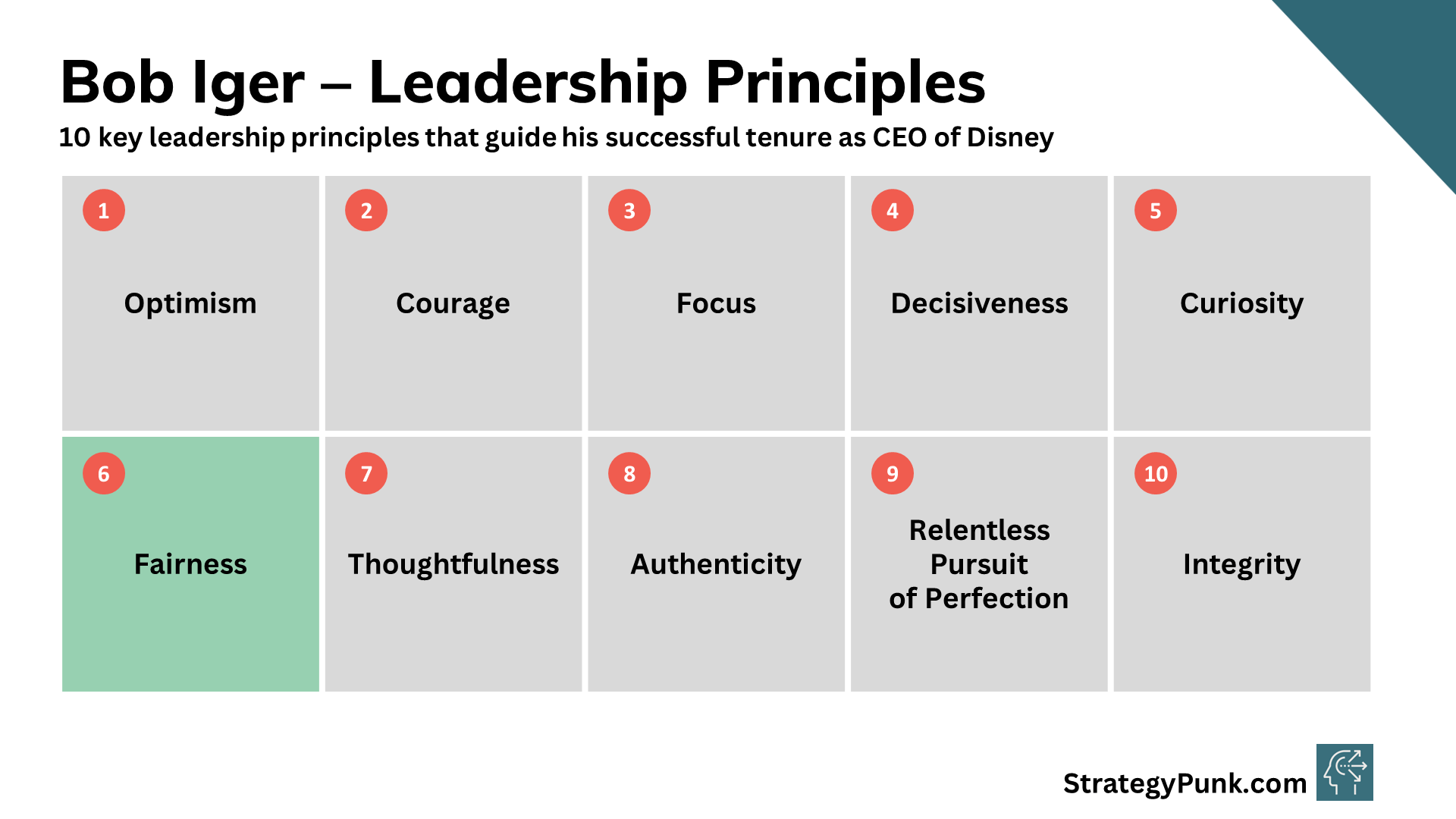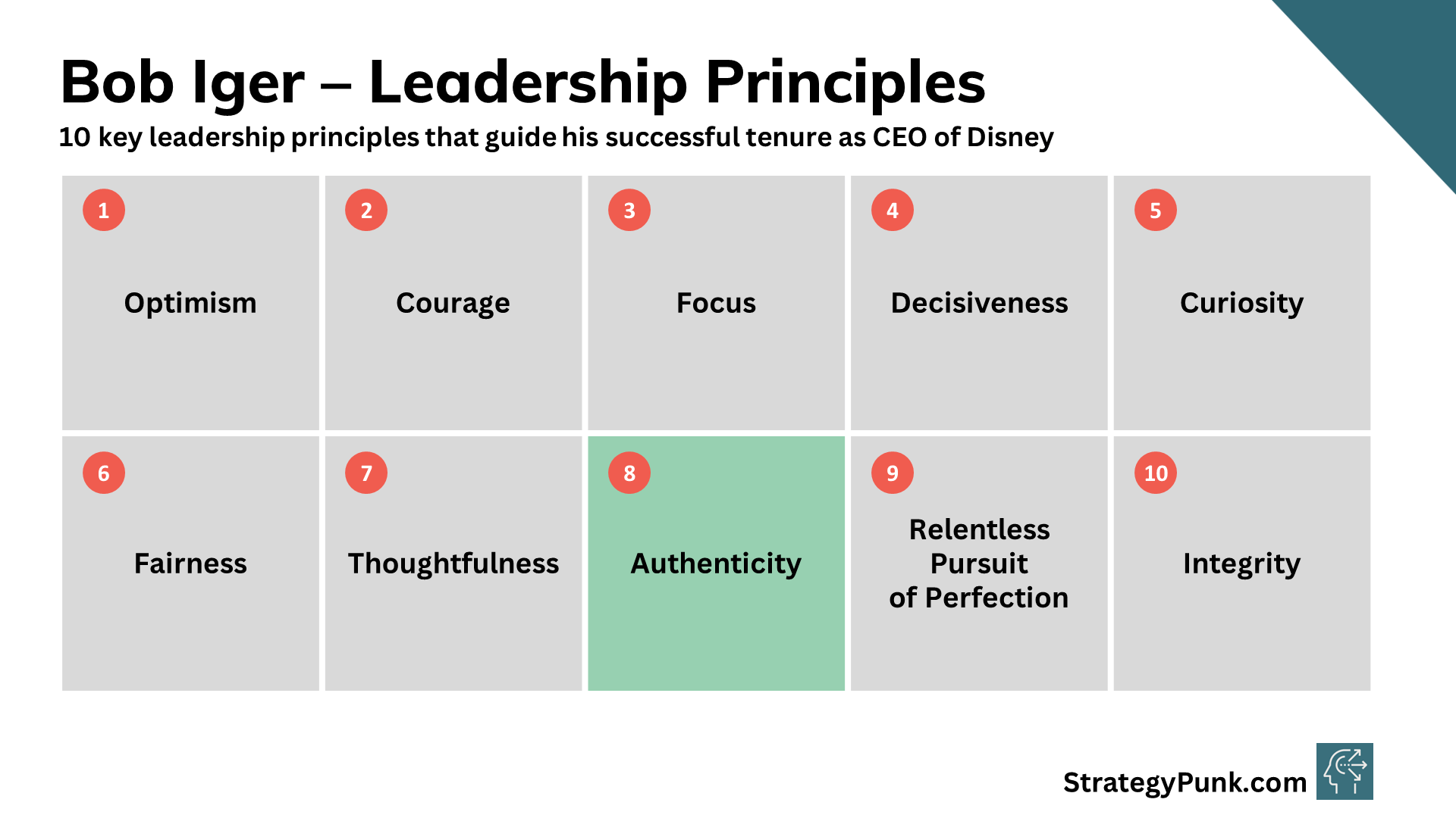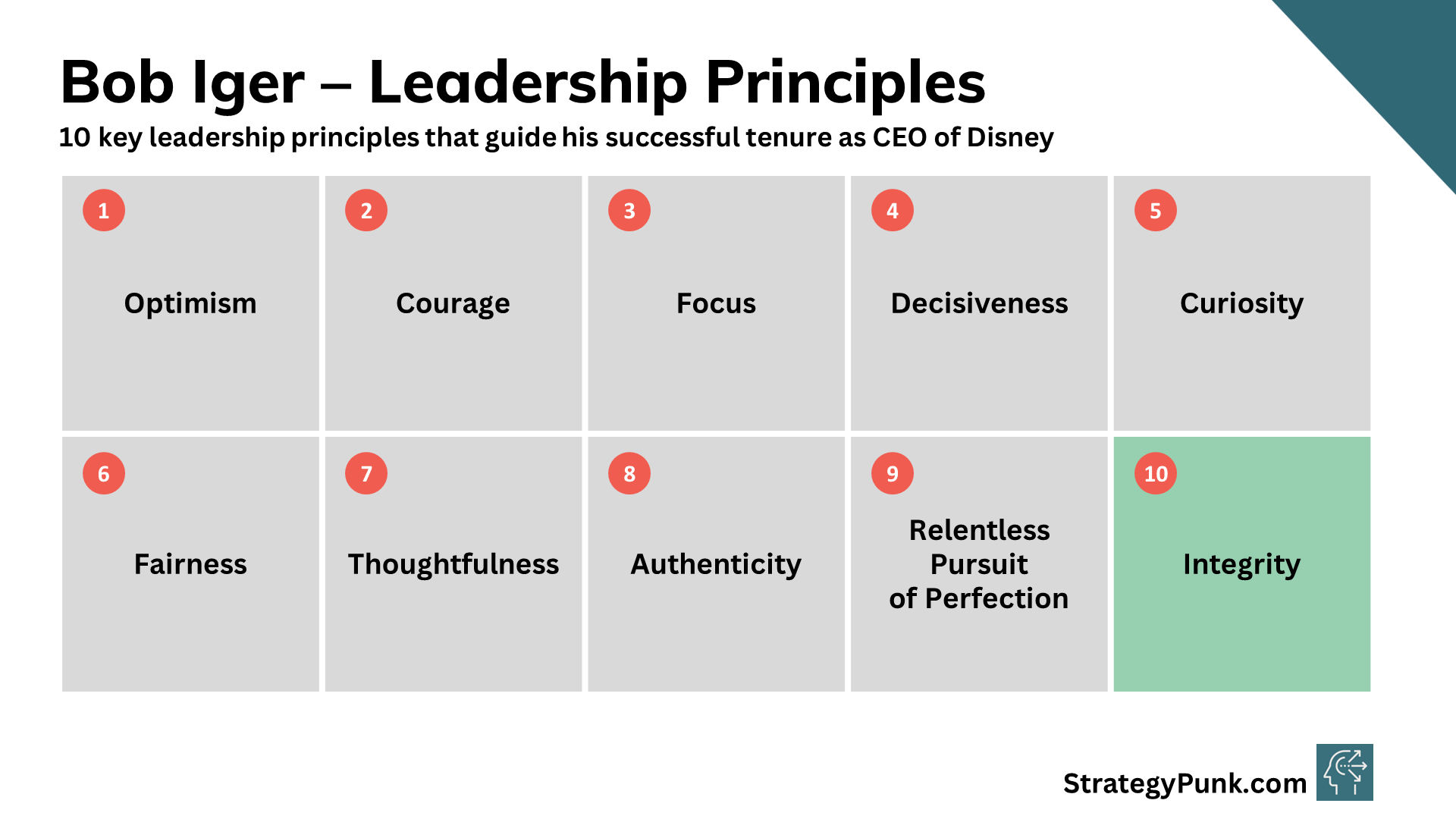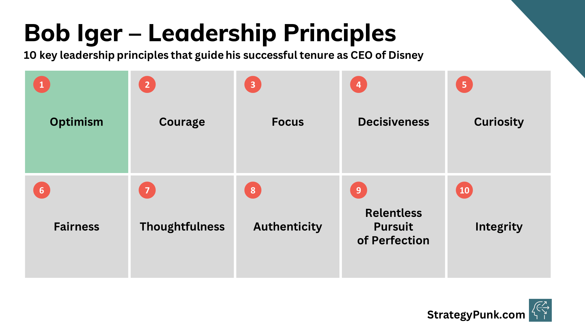 Iger's leadership style emphasized optimism, courage, focus, decisiveness, curiosity, fairness, thoughtfulness, authenticity, pursuit of excellence, and integrity.