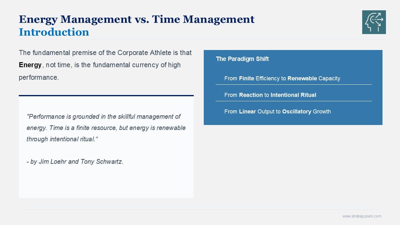 "Performance is grounded in the skillful management of energy. Time is a finite resource, but energy is renewable through intentional ritual." — Jim Loehr and Tony Schwartz.