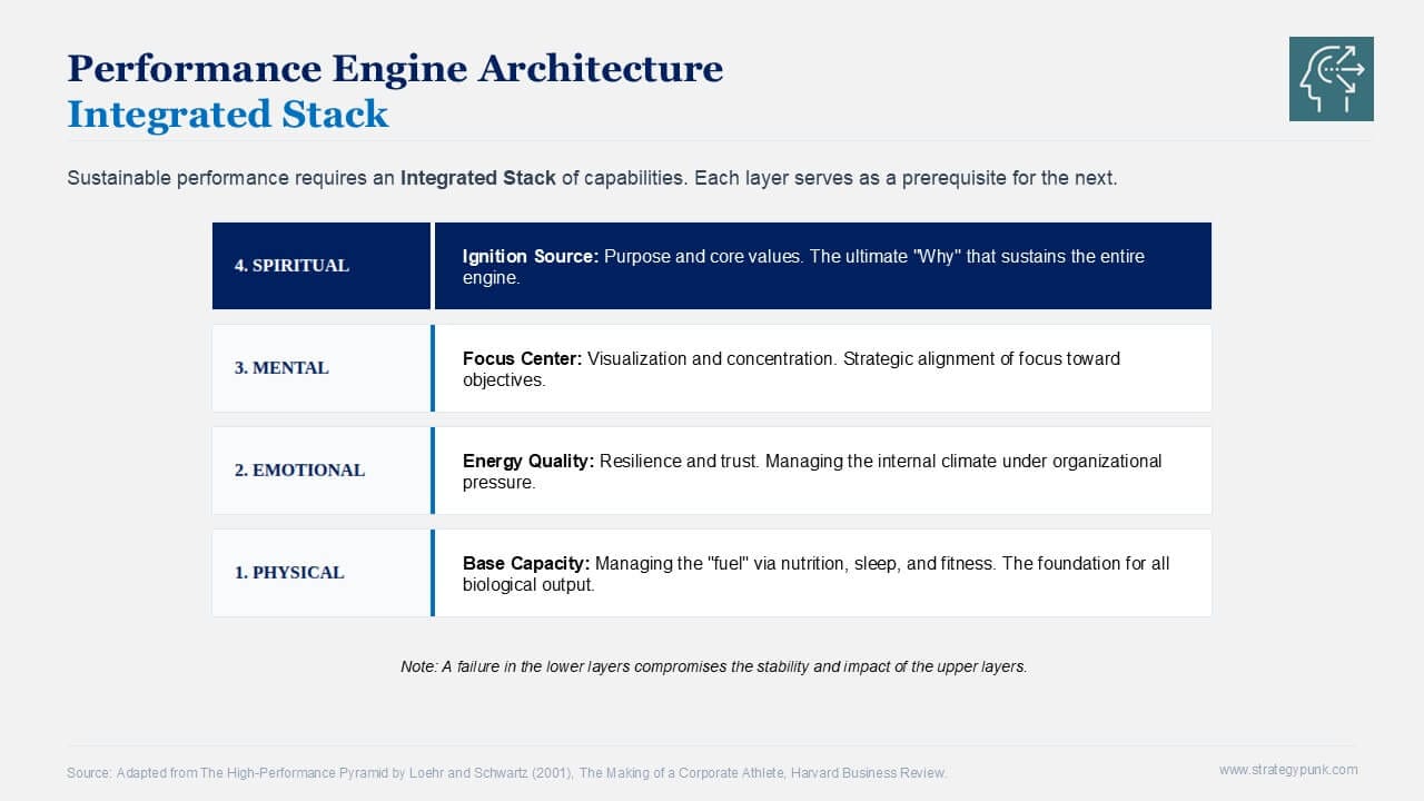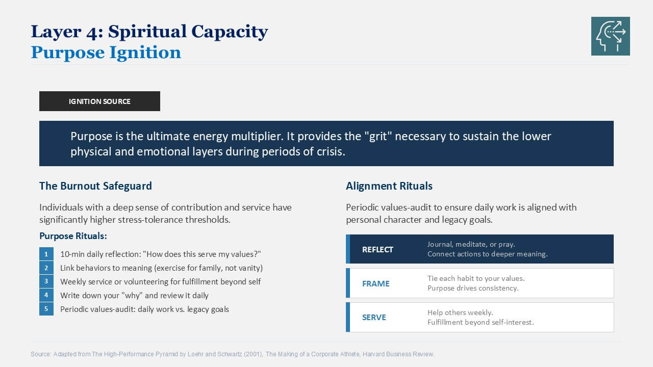 This is the layer most executive development programs skip entirely. But the research is compelling: individuals with a deep sense of contribution and service have significantly higher stress-tolerance thresholds. Purpose provides the grit necessary to sustain the physical and emotional layers during periods of crisis.