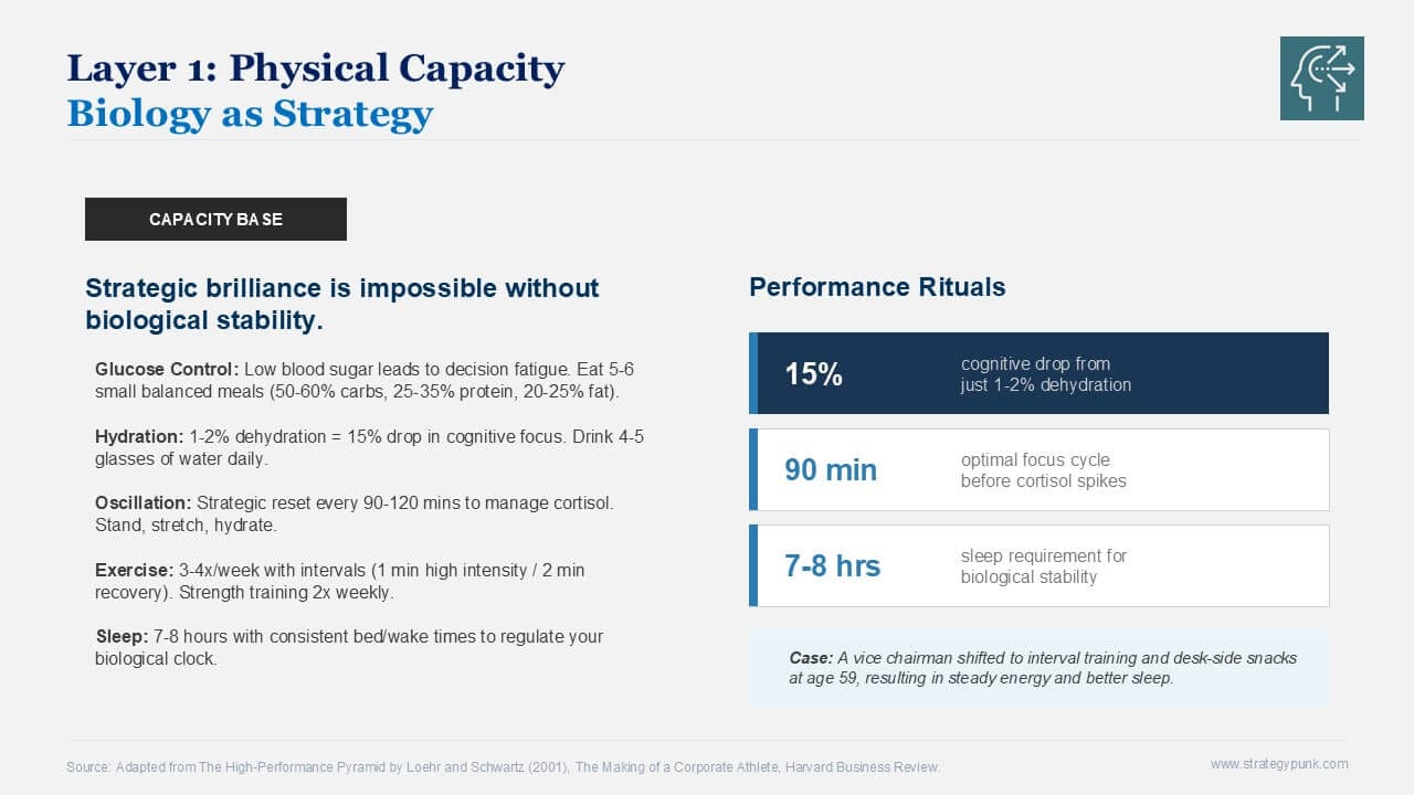 Consider: just 1-2% dehydration correlates with a 15% drop in cognitive focus. Low blood sugar leads directly to poor impulse control and decision fatigue. These aren't wellness talking points. They're performance variables that most leaders ignore while obsessing over dashboard metrics.