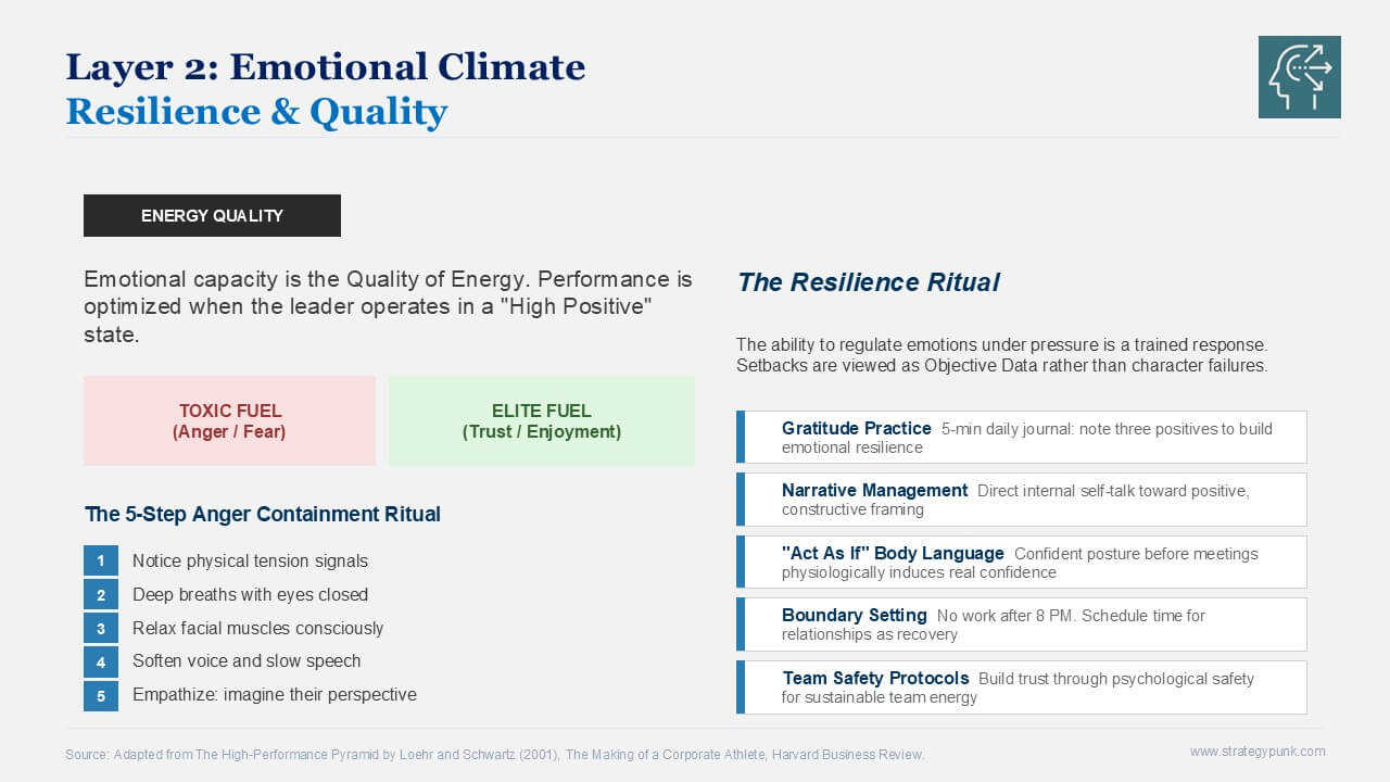Physical energy gets you in the game. Emotional energy determines how you play it. The framework treats emotional capacity as the "quality of energy," and performance is optimized when a leader operates in what Loehr and Schwartz call a "High Positive" state: trust, enjoyment, and optimism rather than anger and fear.