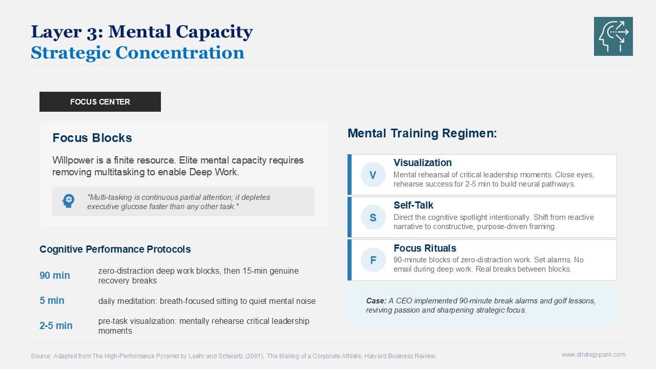 Willpower is a finite resource. The framework's mental layer is built on this premise, and its implications are significant: multitasking isn't a productivity strategy; it's a performance destroyer. It depletes executive glucose faster than almost any other cognitive activity.