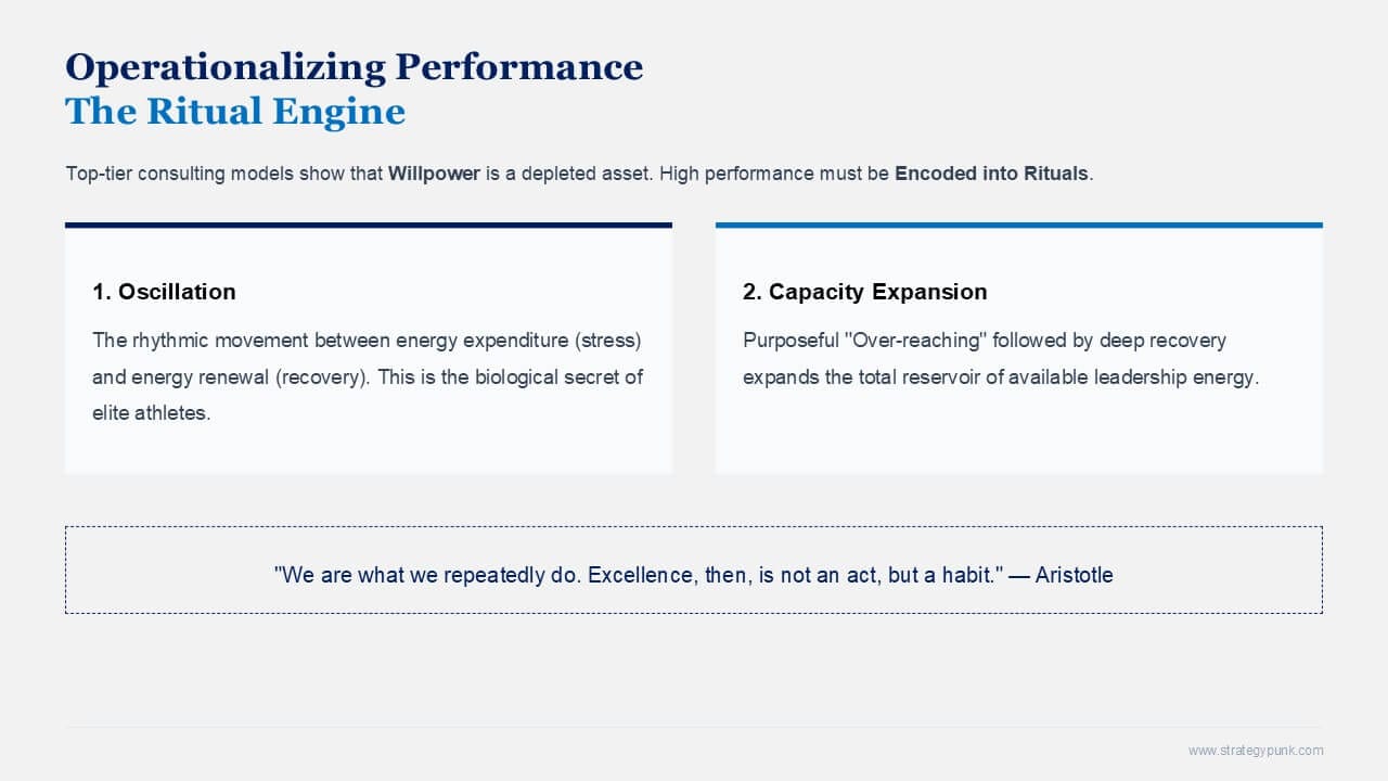 The paradigm shift is threefold: from finite efficiency to renewable capacity, from reaction to intentional ritual, and from linear output to oscillatory growth. Stop asking "how do I fit more in?" and start asking "how do I show up with more capacity?"