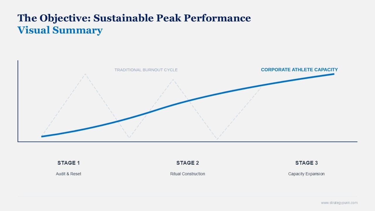 The principle of oscillation, alternating between stress and recovery, is the biological secret borrowed from elite sport. Traditional corporate life is a flat line of sustained stress. The Corporate Athlete approach replaces that with rhythmic cycles that build capacity rather than deplete it.