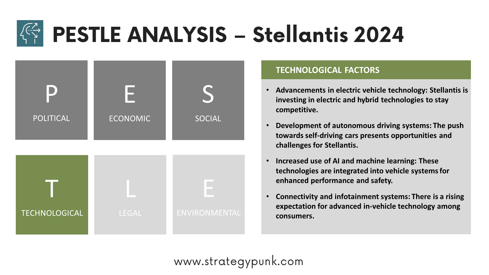 One of the most significant technological factors shaping Stellantis' future is the rapid advancement of electric vehicle (EV) technology. The company has established dedicated EV platforms and collaborates with industry leaders to develop next-generation batteries, charging infrastructure, and autonomous driving capabilities.