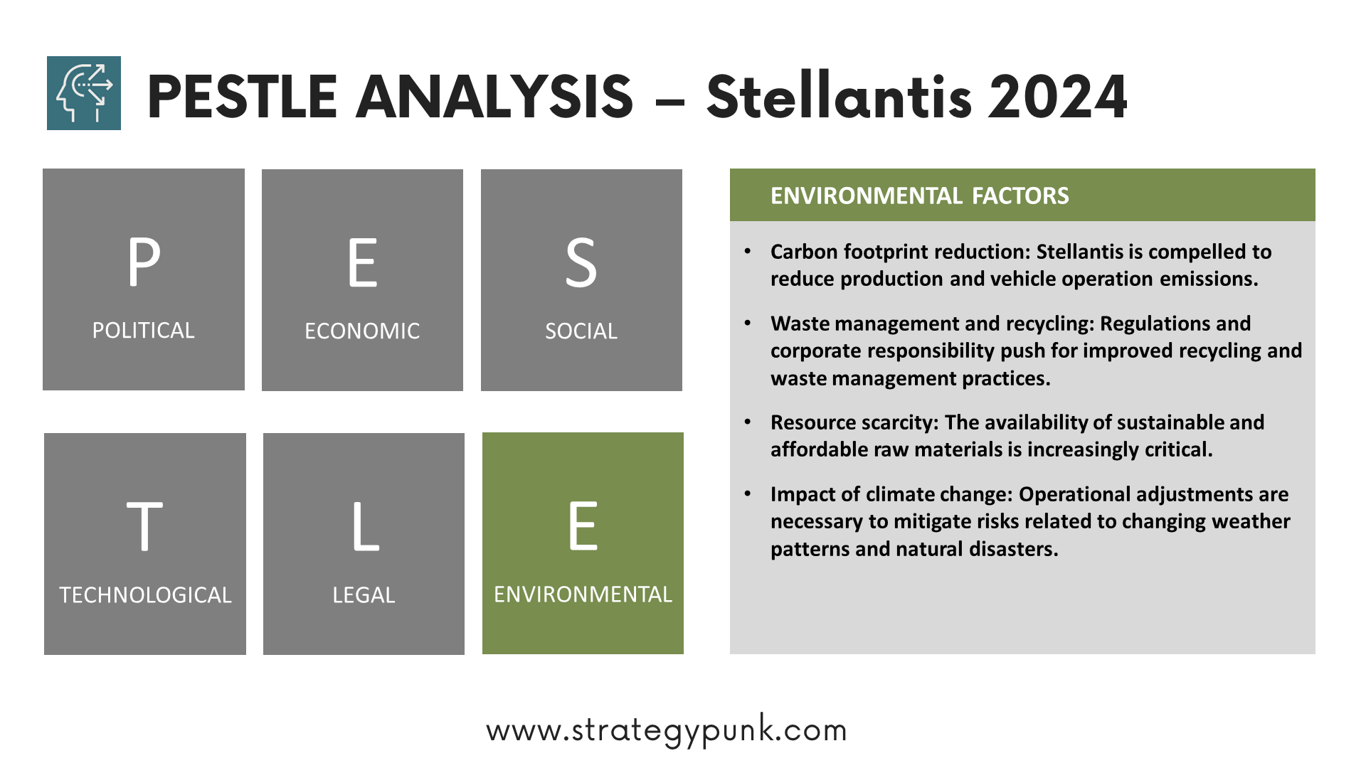One of the most significant environmental factors influencing Stellantis is the growing concern over climate change and the need to reduce greenhouse gas emissions. The company has set ambitious targets to achieve carbon neutrality by 2038, focusing on electrification, energy-efficient manufacturing processes, and renewable energy sources.