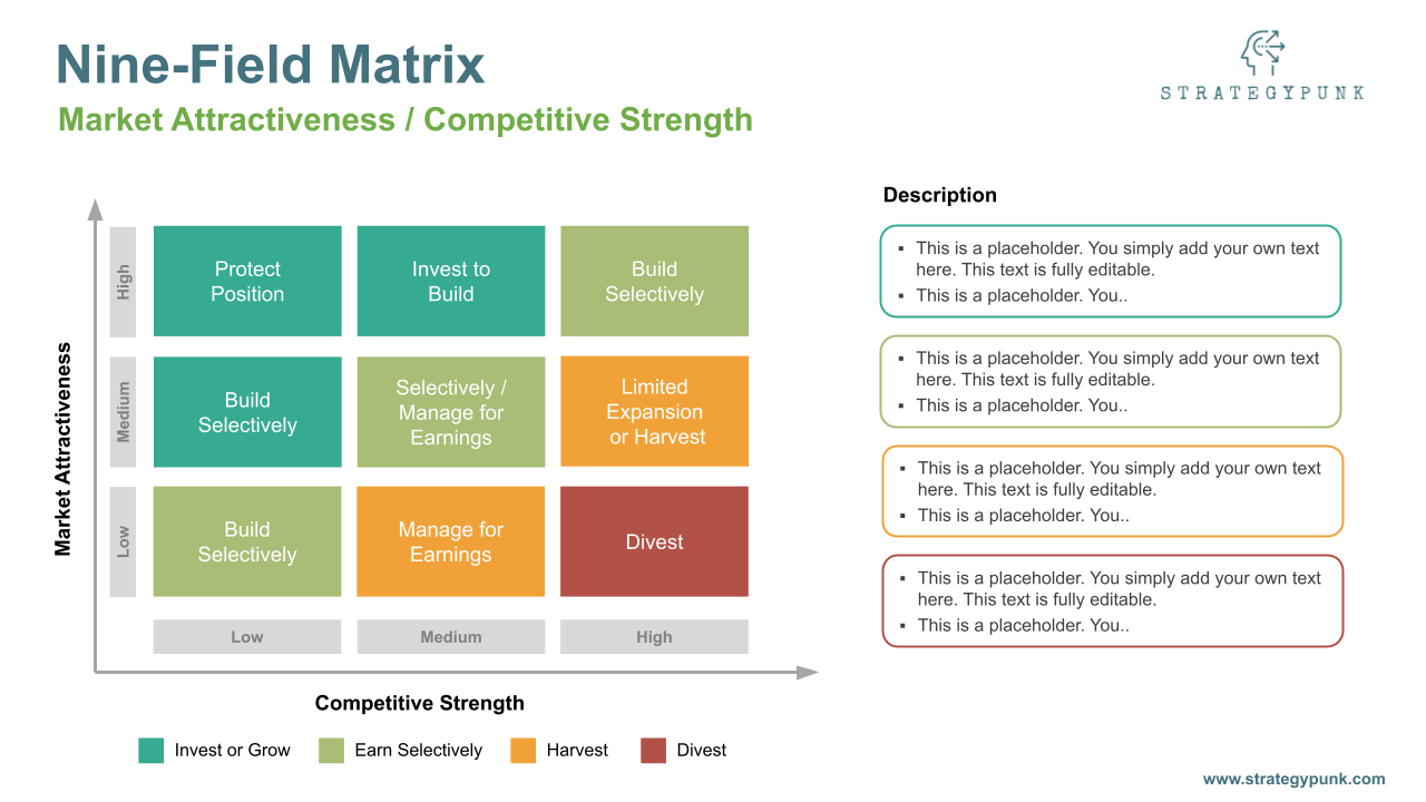 - Clear visualization: The matrix clearly visualizes a company's business portfolio, placing each business unit in one of the nine cells. This makes it easy for companies to identify their most and least attractive business units.