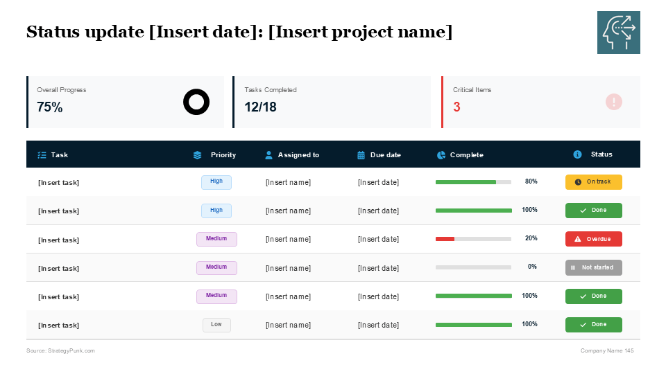 Track project tasks, priorities, and deadlines with this free status update template. Download the PDF instantly or get the editable PPT after signing up.