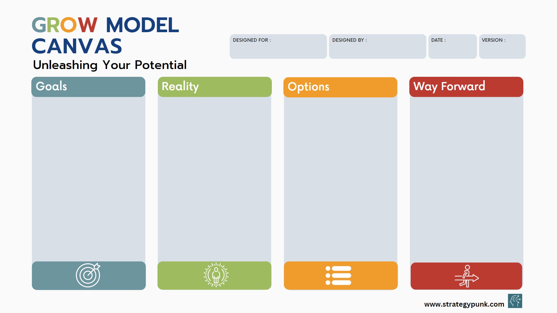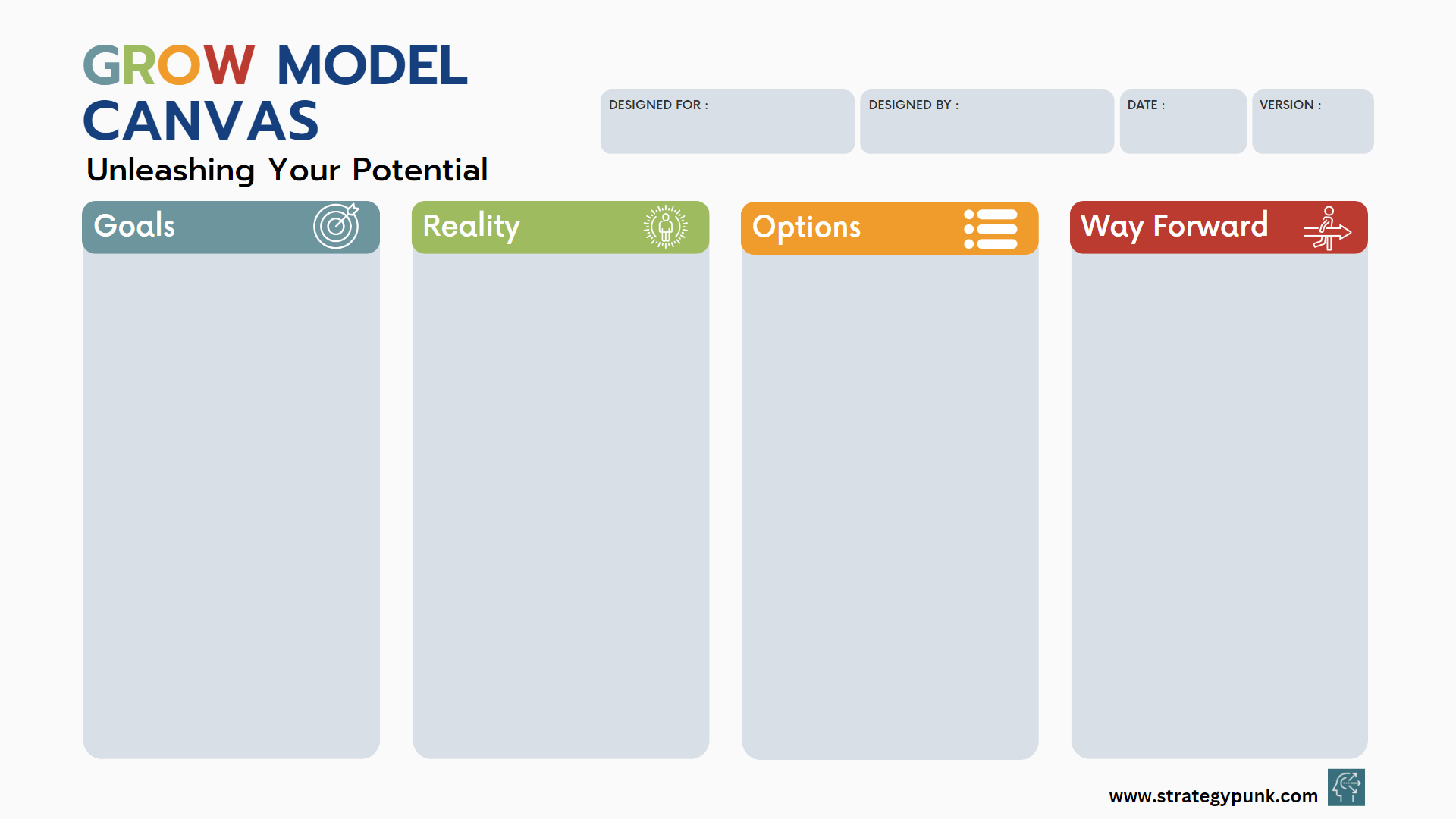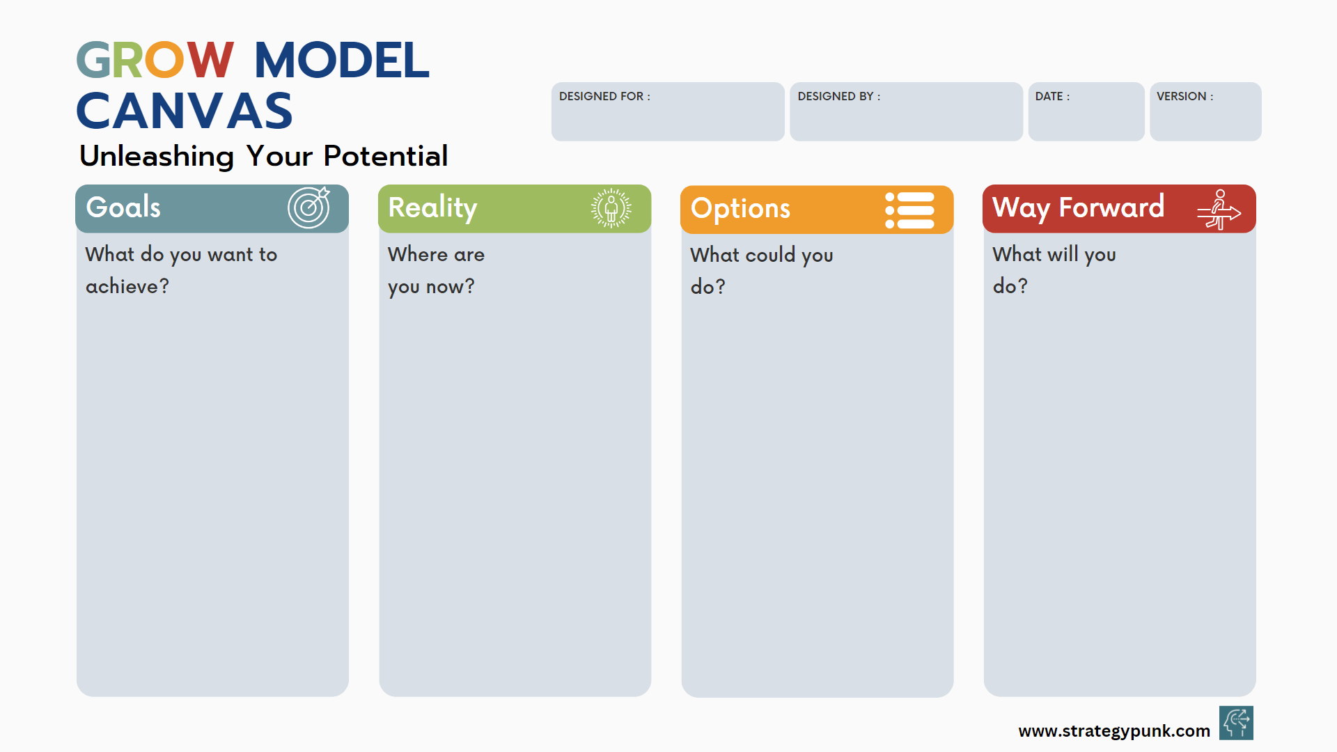 It's designed for clarity and ease of use and is fully customizable. This tool will be your roadmap, guiding you from where you are now to where you want to be. You can use a printout using the GROW Model Canvas PDF Template or do it digitally with the GROW Model Canvas PowerPoint Template.