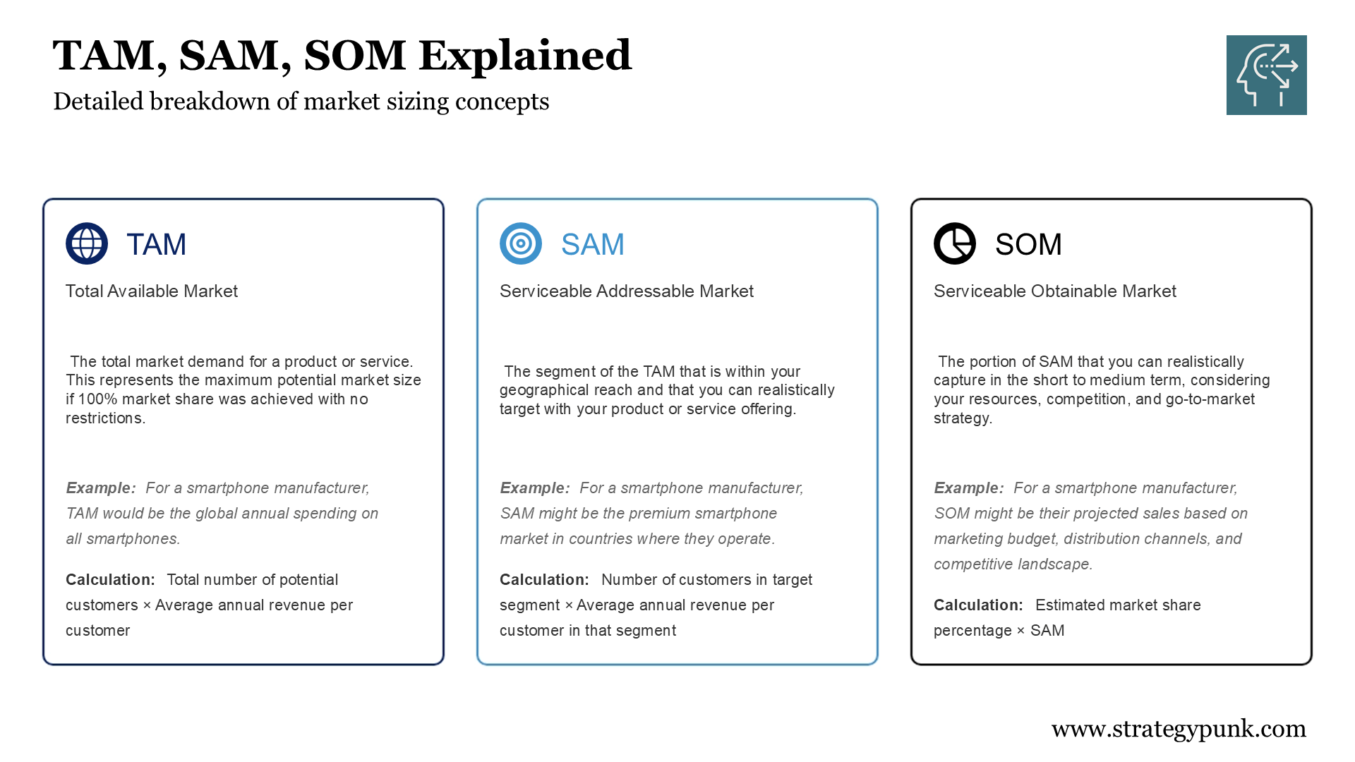Third, it aligns internal and external communication. Leadership needs to see the total addressable market (TAM). Operations need to plan for realistic targets (SOM). The framework enables you to address both audiences with consistent data.