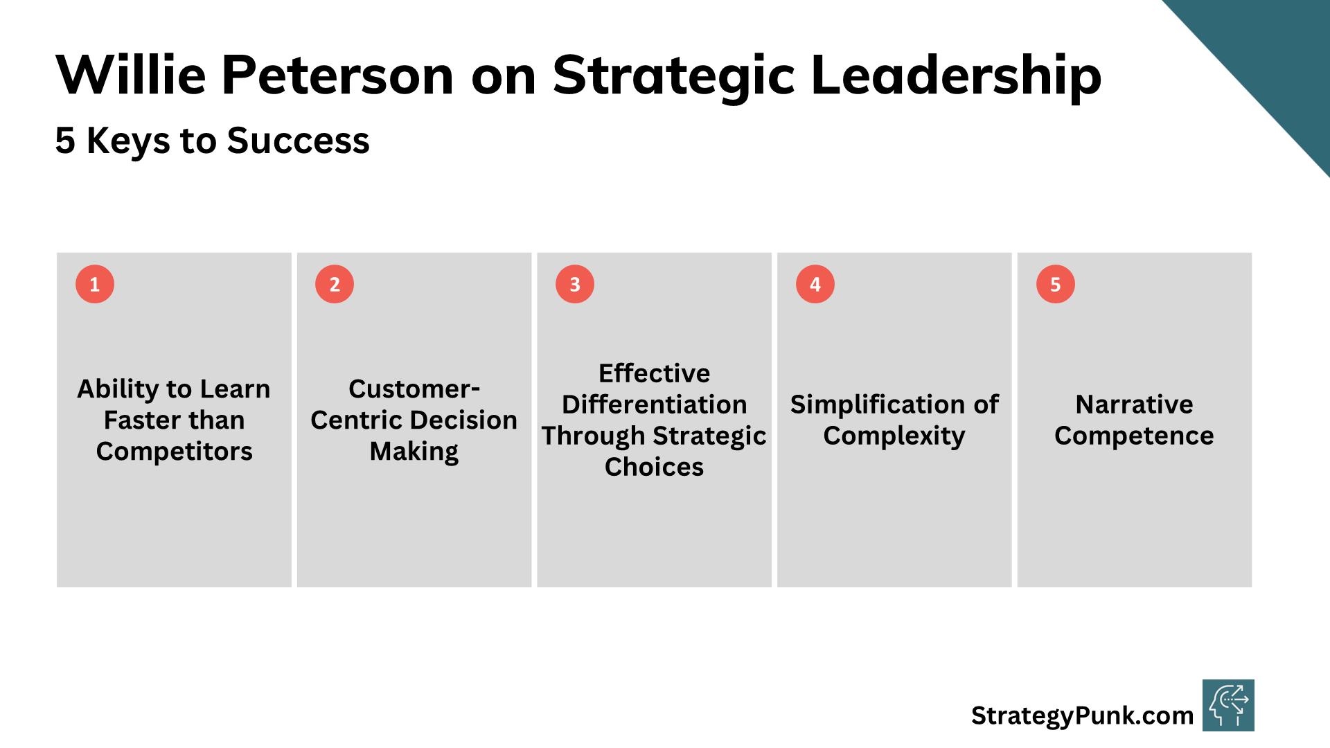 Explore Willie Peterson's 5 crucial strategies for strategic leadership. Master learning, customer focus, and effective storytelling.