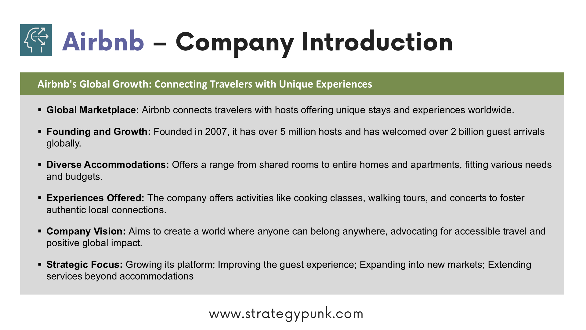 Airbnb's strategy is focused on growing its platform, improving the guest experience, expanding into new markets, and expanding beyond accommodations. The company is well-positioned for continued growth in the years to come.
