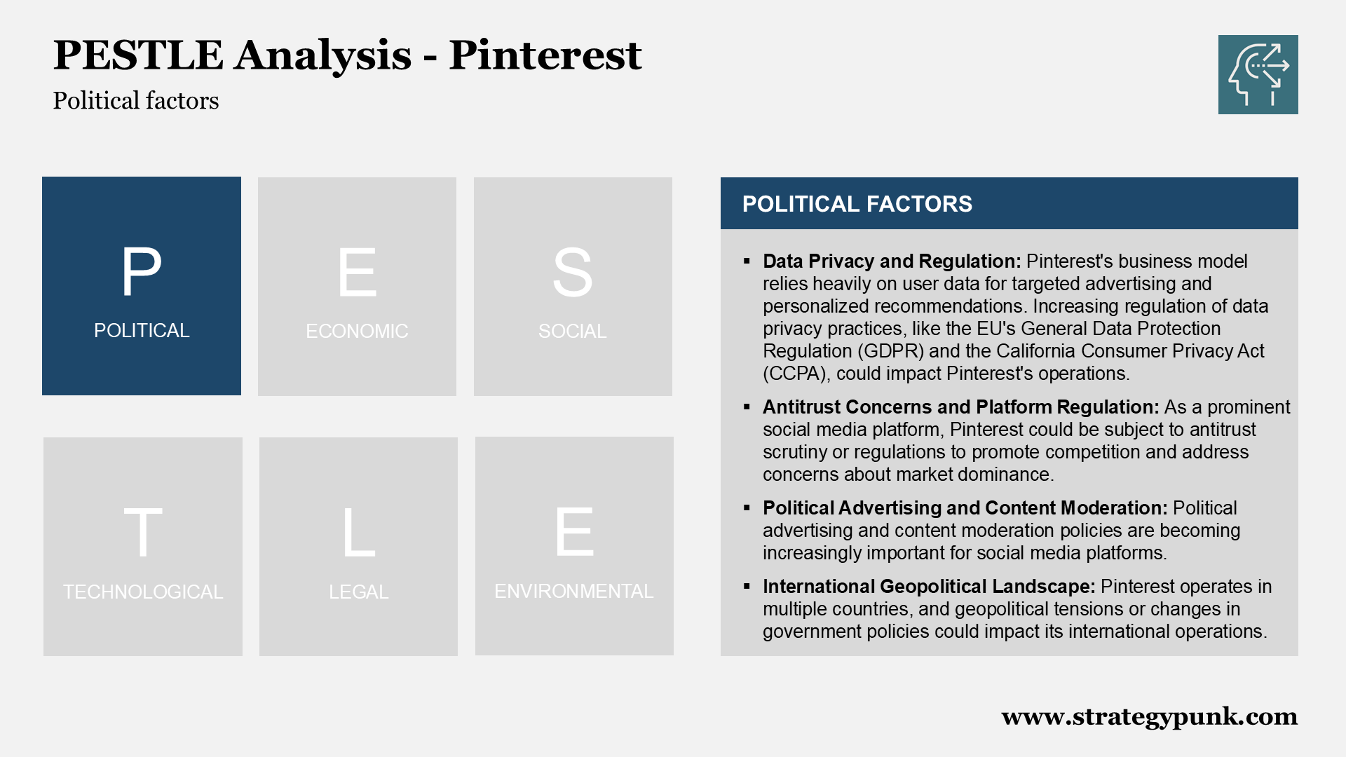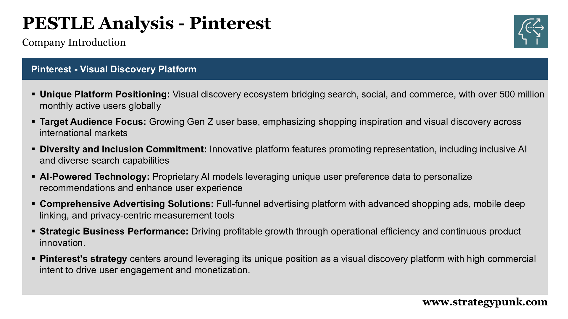 Pinterest, a platform transforming visual discovery and e-commerce, faces multifaceted challenges and opportunities across political, economic, social, technological, legal, and environmental domains.