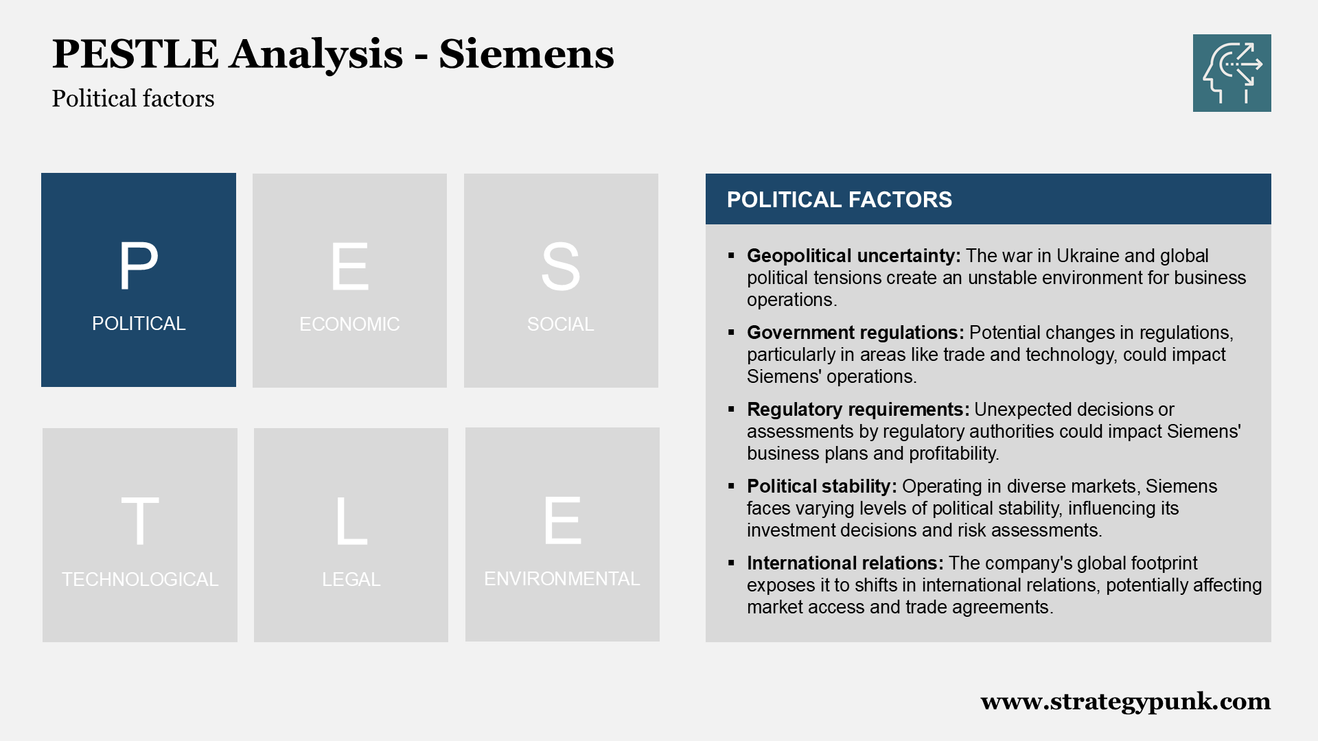 - Political stability: Operating in diverse markets, Siemens faces varying levels of political stability, influencing its investment decisions and risk assessments.