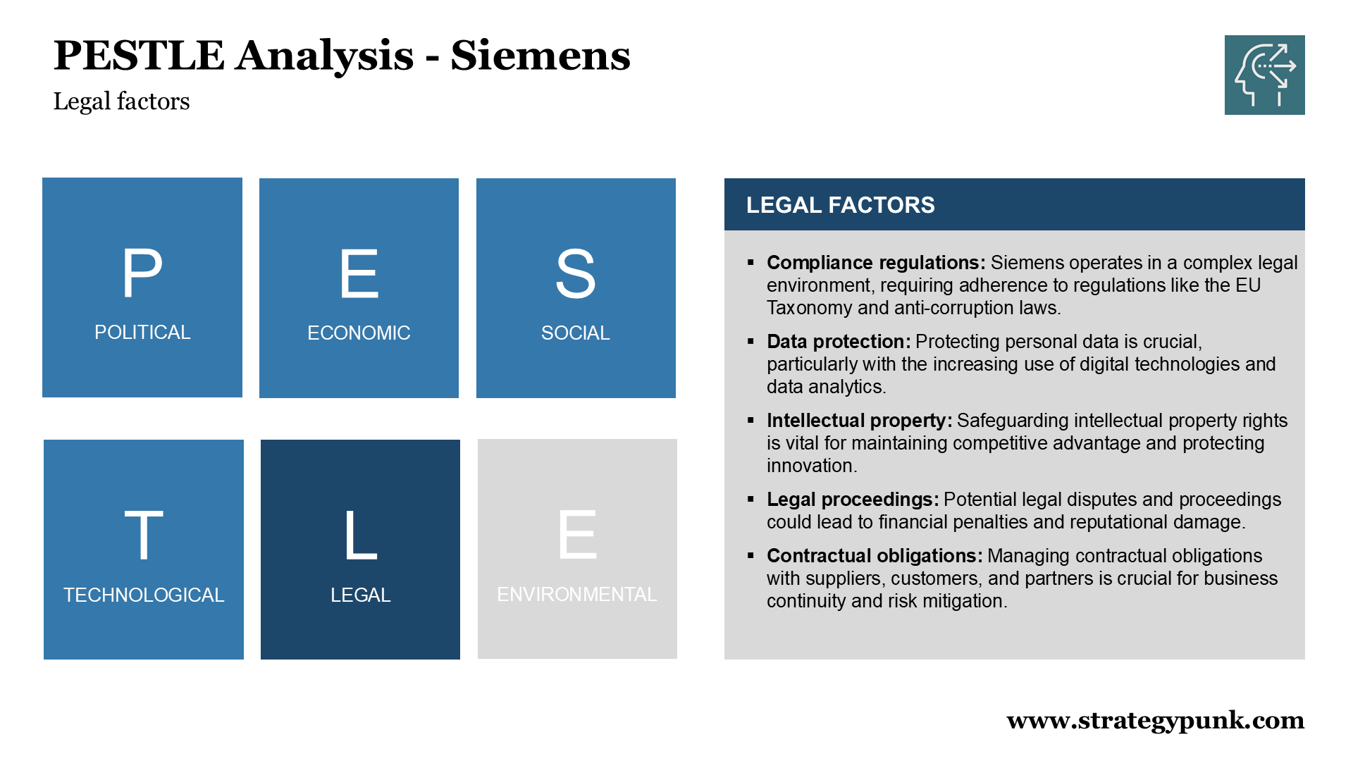 Operating in a complex legal environment requires Siemens to comply strictly with regulations, including EU Taxonomy and data protection laws.