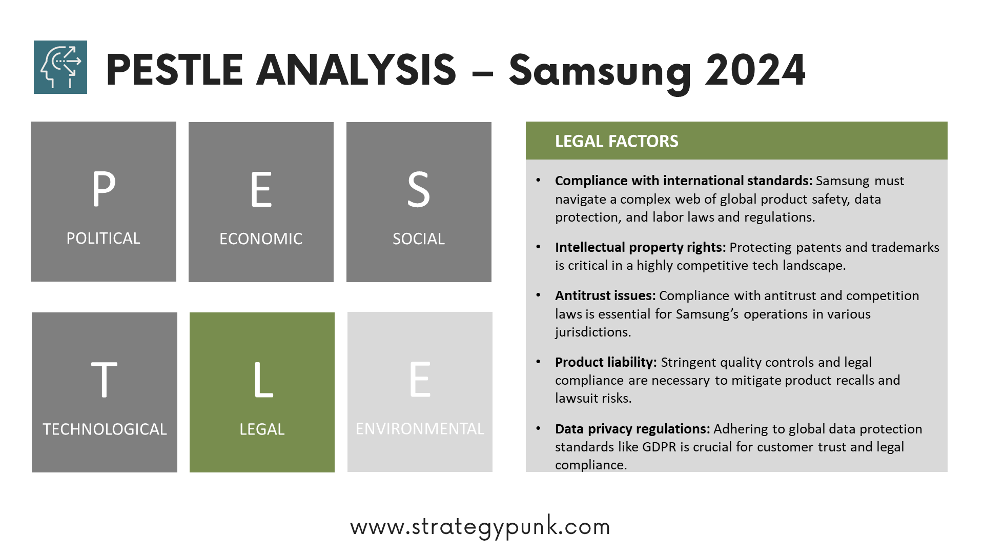 - Antitrust issues: Compliance with antitrust and competition laws is essential for Samsung’s operations in various jurisdictions.