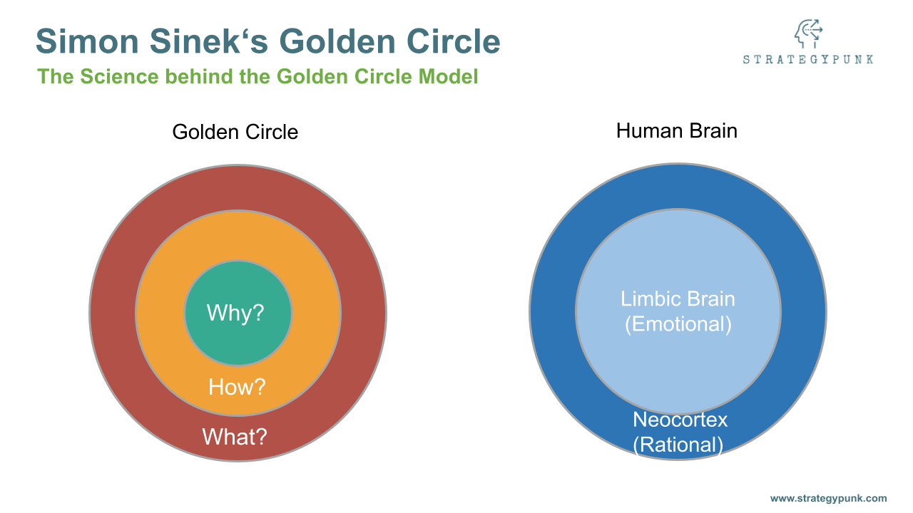 Sinek argues that the Golden Circle maps directly onto the structure of the human brain. The neocortex, responsible for rational thought and language, corresponds to the WHAT ring. The limbic system, which governs feelings, trust, and decision making, corresponds to the WHY and HOW rings.