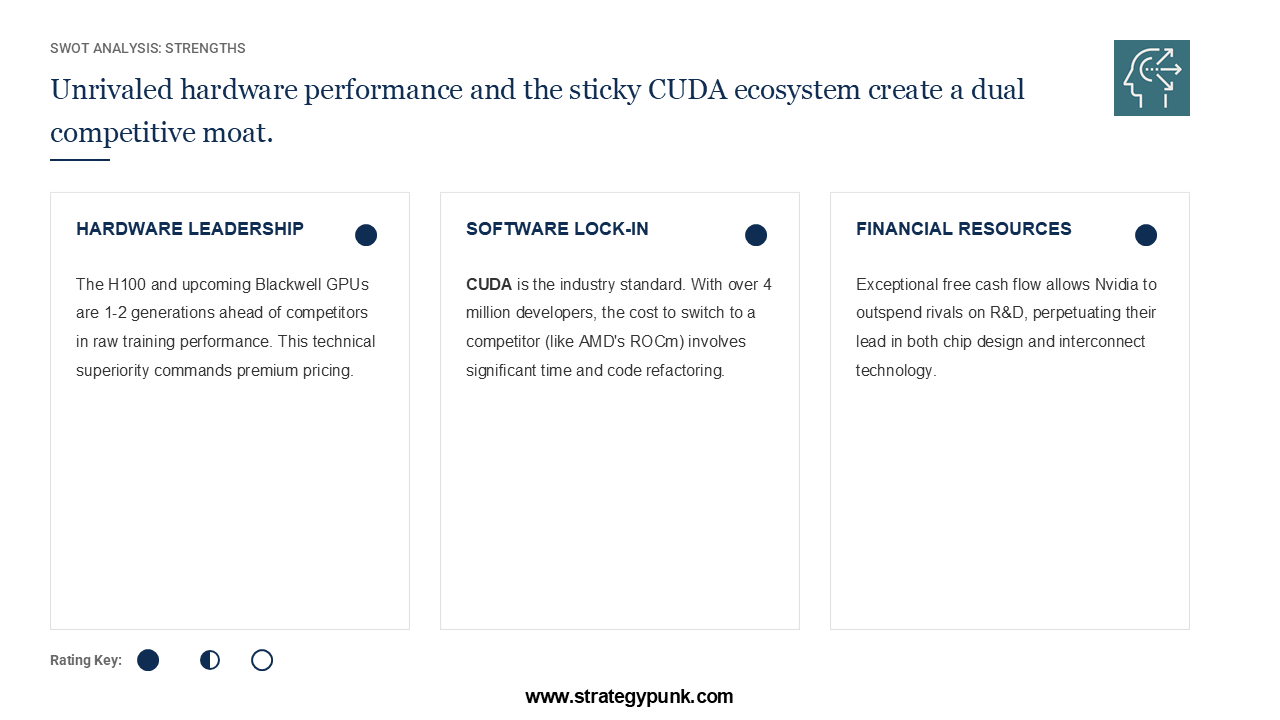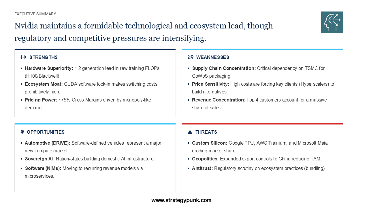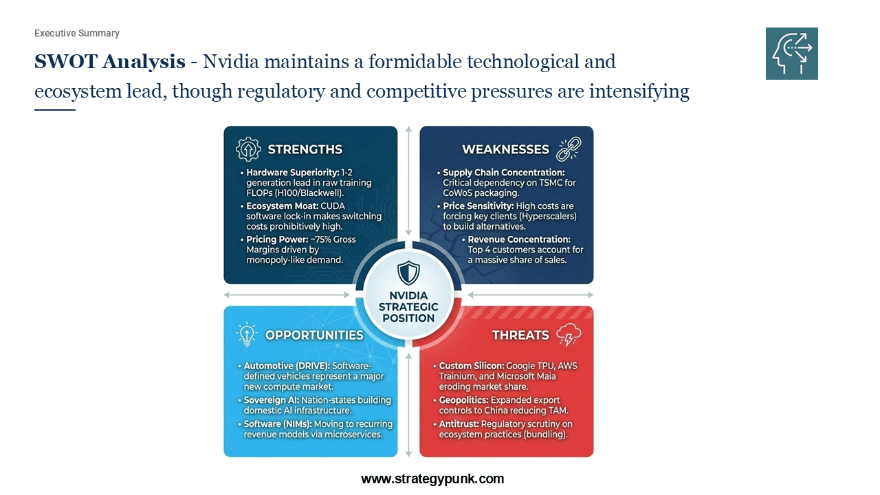 Nvidia strategic analysis: SWOT breakdown of AI chip dominance, CUDA moat, and key threats. Free PDF download.