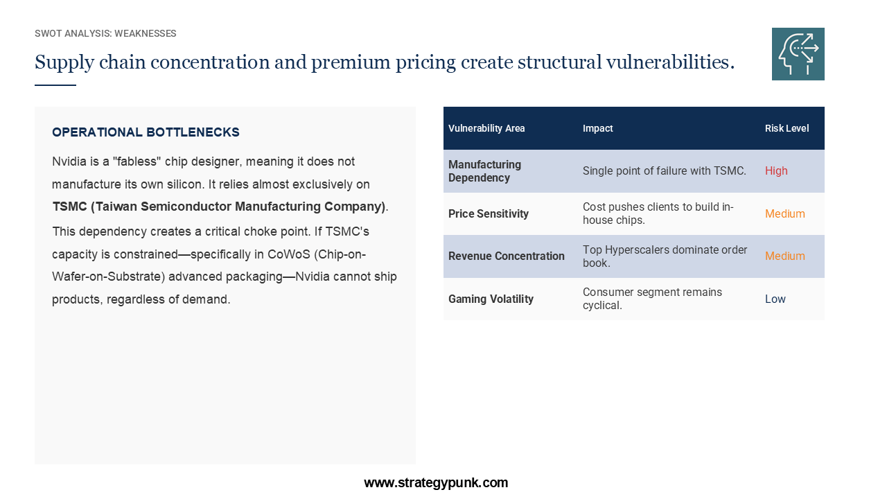 First, Nvidia depends on TSMC for manufacturing. As a fabless chip designer, Nvidia cannot build its own products. If TSMC faces capacity constraints or geopolitical disruption, Nvidia cannot ship even if demand is high. This single point of failure sits outside Nvidia's control.
