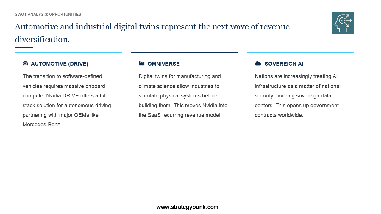The Omniverse platform moves Nvidia into recurring revenue. Digital twins for manufacturing and climate science let industries simulate physical systems before building them. This shifts the business model from selling hardware to licensing software.