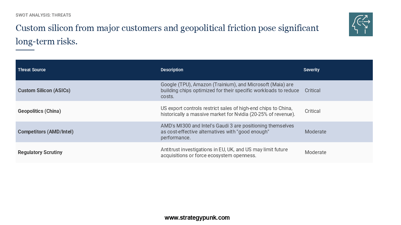 Second, high prices push customers toward alternatives. Google, Amazon, and Microsoft have each launched their own AI chip programs. When your biggest buyers start building competing products, the warning sign is clear.