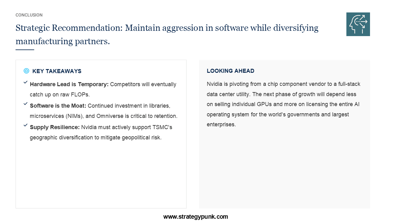 Nvidia must keep investing in libraries, microservices, and Omniverse to retain customers. The company also needs to support TSMC's geographic diversification to reduce supply chain risk.
