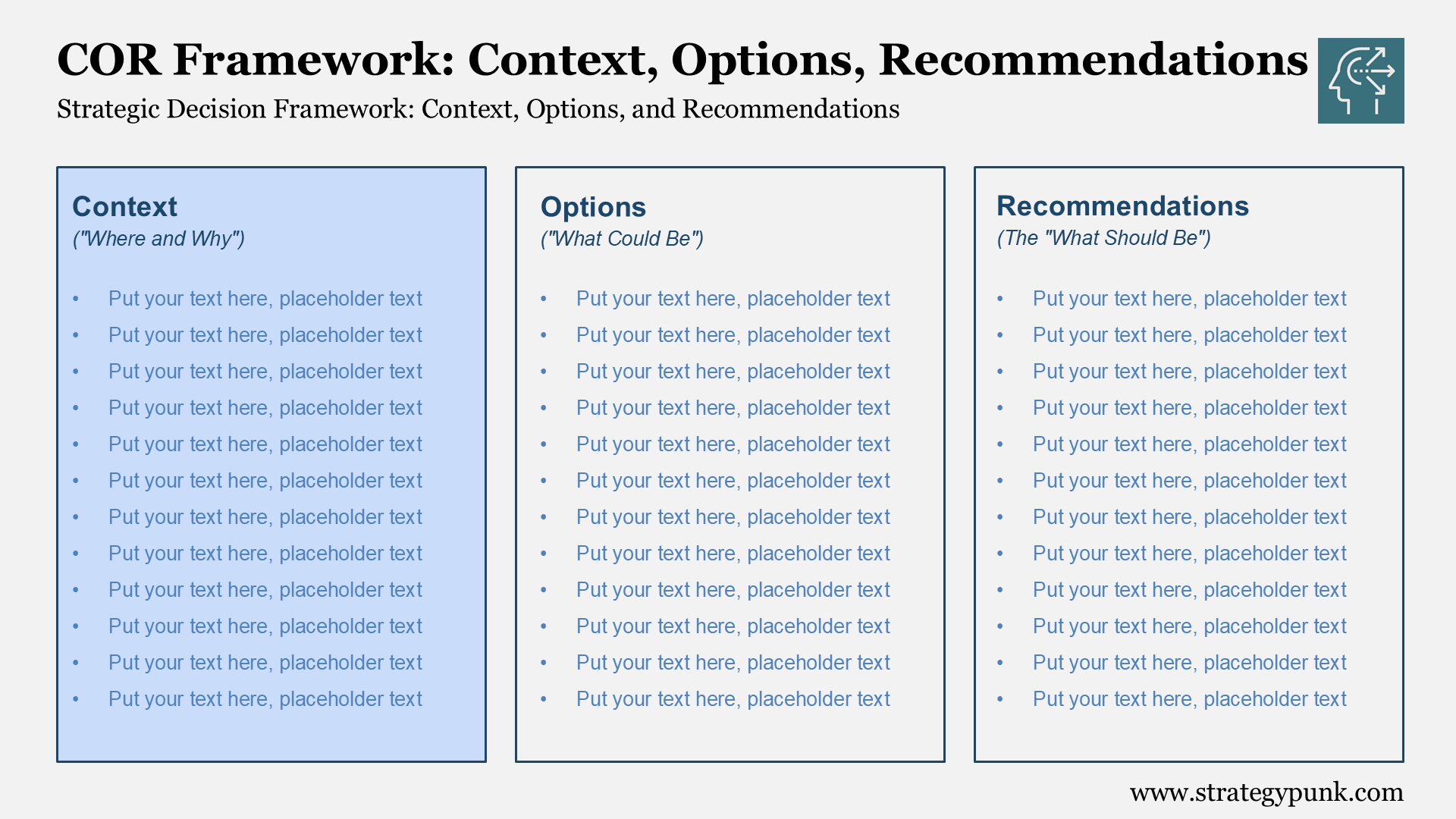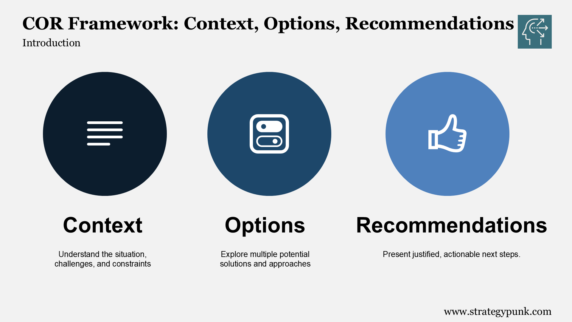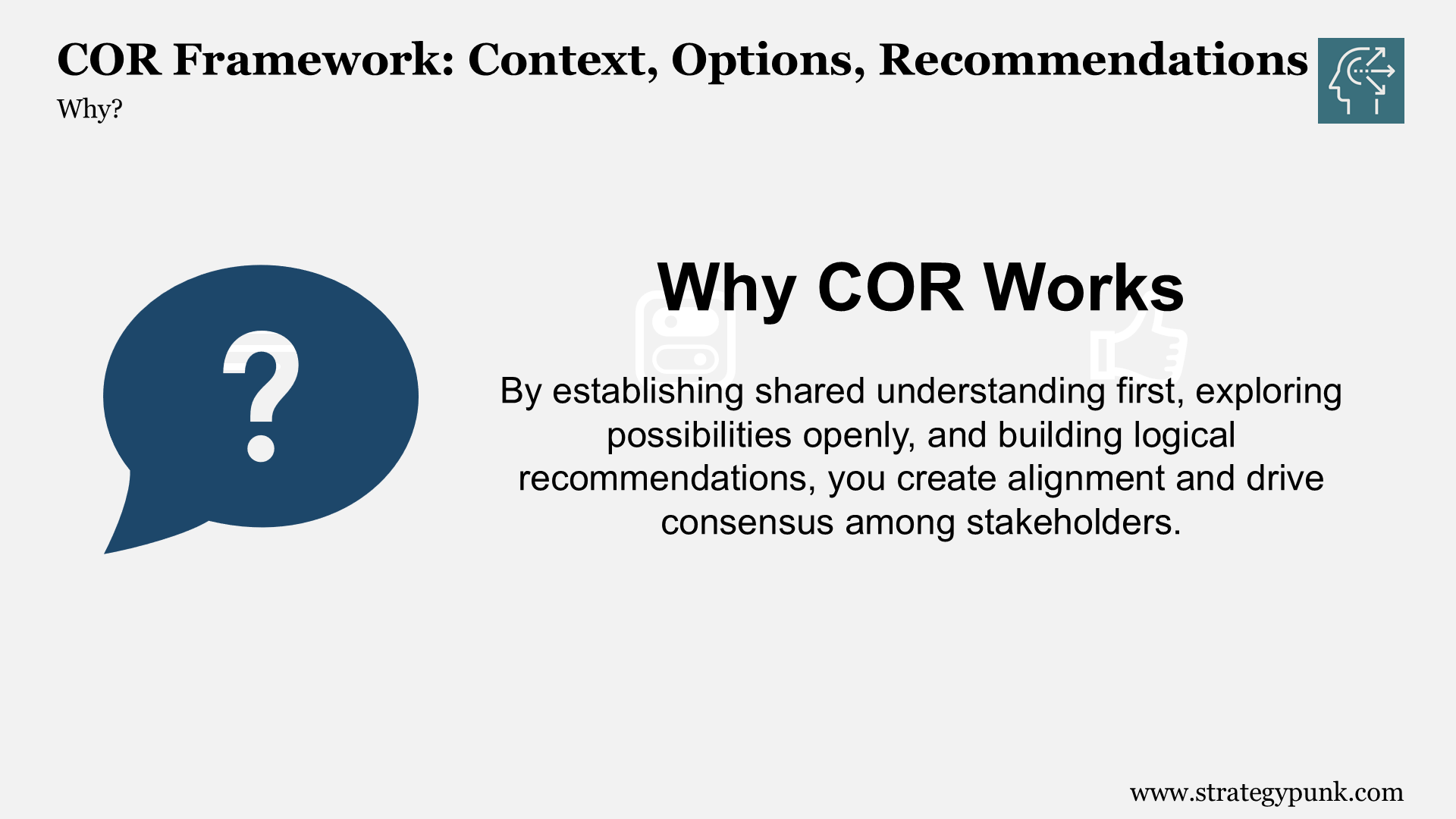 That's precisely why the Context, Options, and Recommendations (COR) framework is a game-changer for strategic decision-making. Instead of letting meetings devolve into solution battles, COR forces everyone to start with the same foundation: understanding the actual situation before exploring potential solutions.