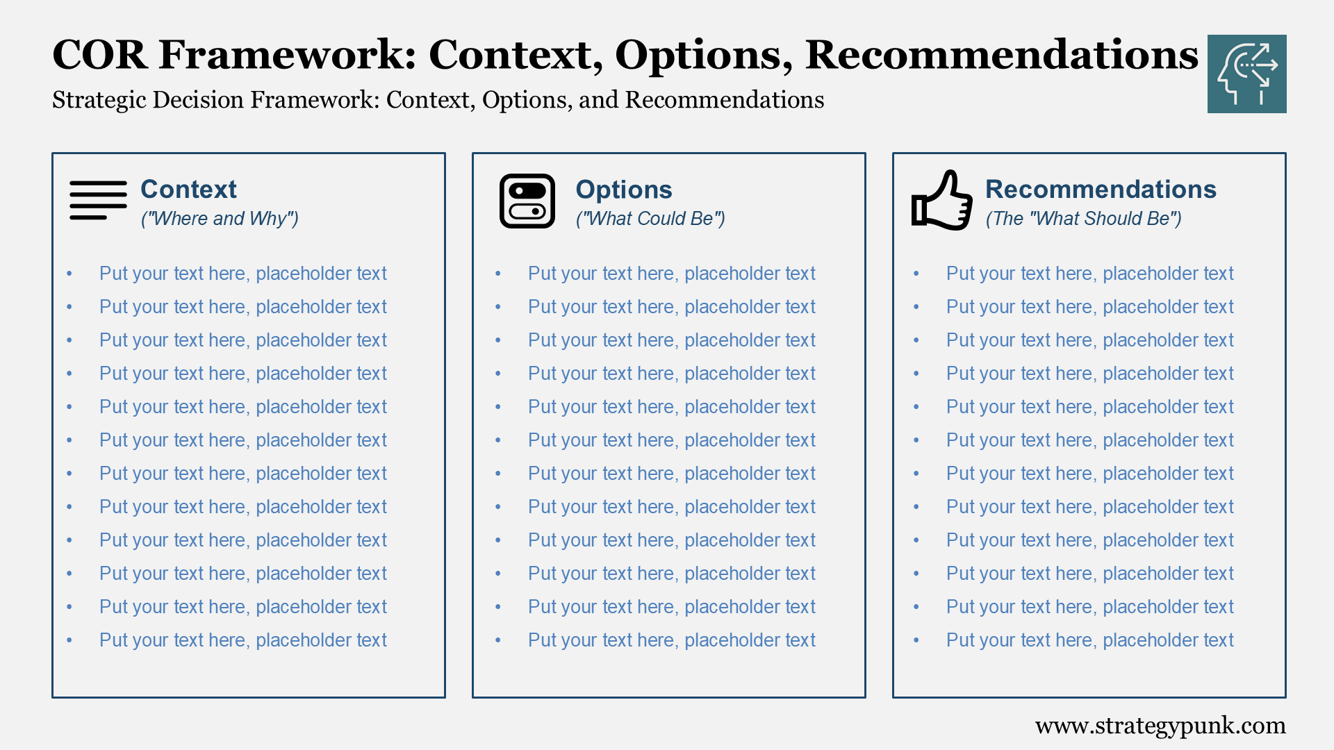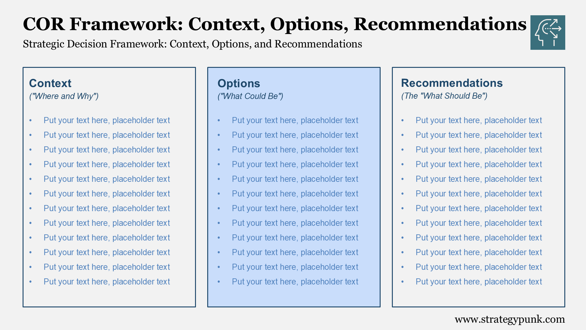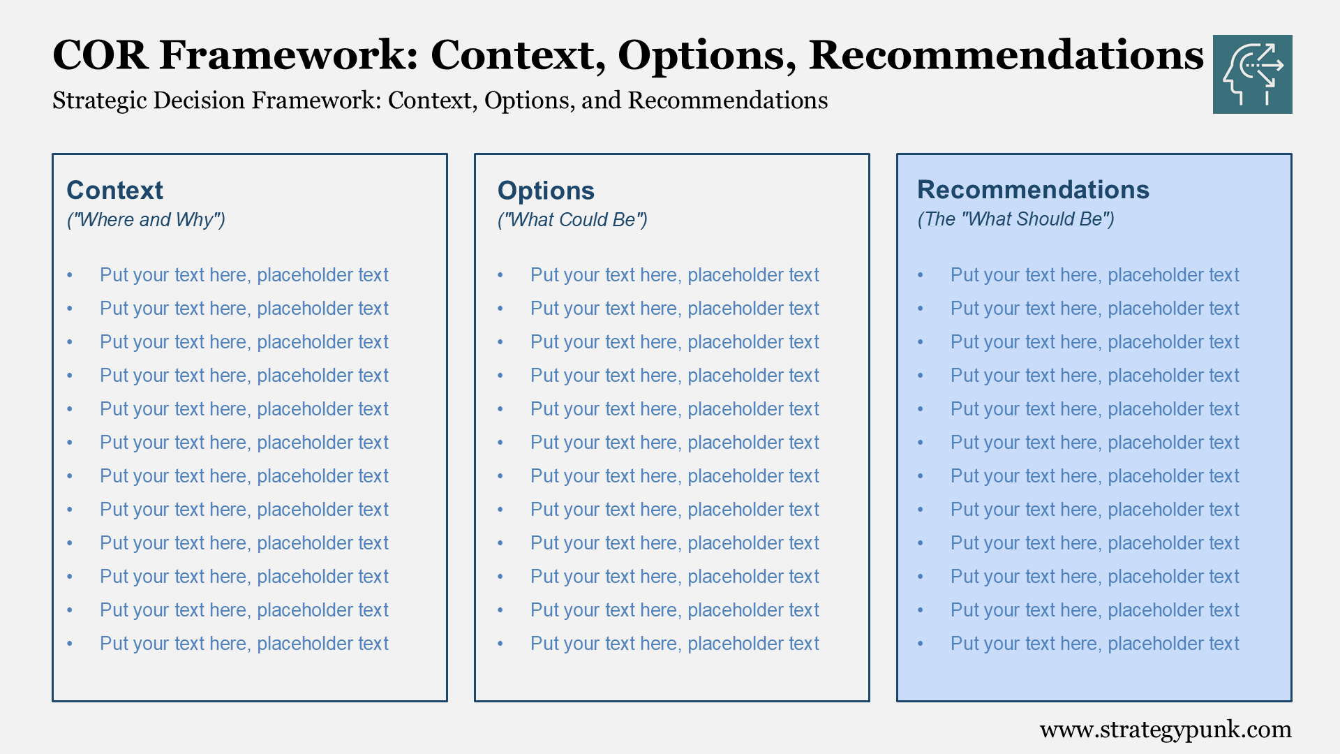 That's precisely why the Context, Options, and Recommendations (COR) framework is a game-changer for strategic decision-making. Instead of letting meetings devolve into solution battles, COR forces everyone to start with the same foundation: understanding the actual situation before exploring potential solutions.