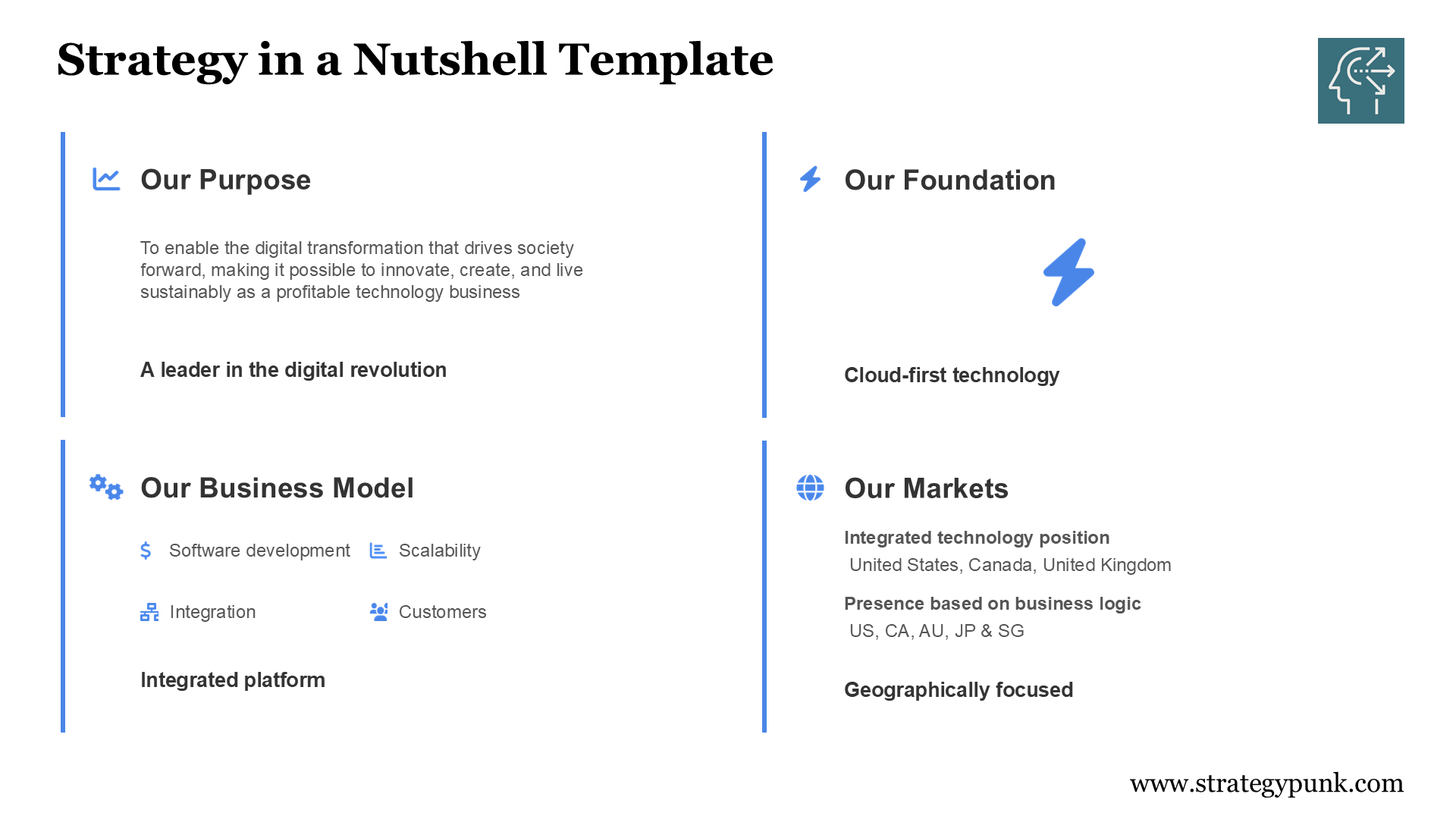 The Strategy in a Nutshell template isn't meant to replace detailed strategic planning—it's intended to clarify it. Use this framework to: