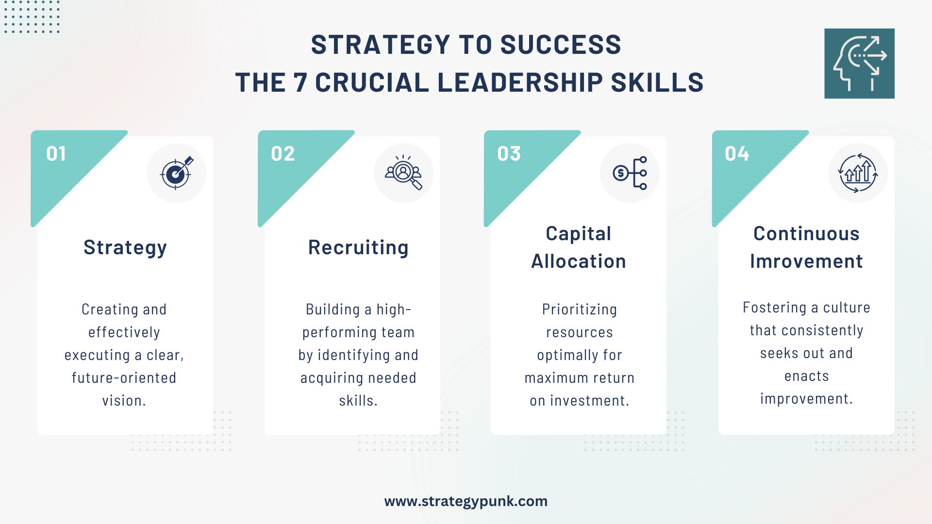 As a leader, possessing the 7 core skills discussed in this article can significantly impact your team and organization. Effective capital allocation can increase profits and growth, while a well-crafted strategy can provide direction and focus. Continuous improvement ensures that your team always strives to improve, and recruiting the right people can create a solid and capable team.