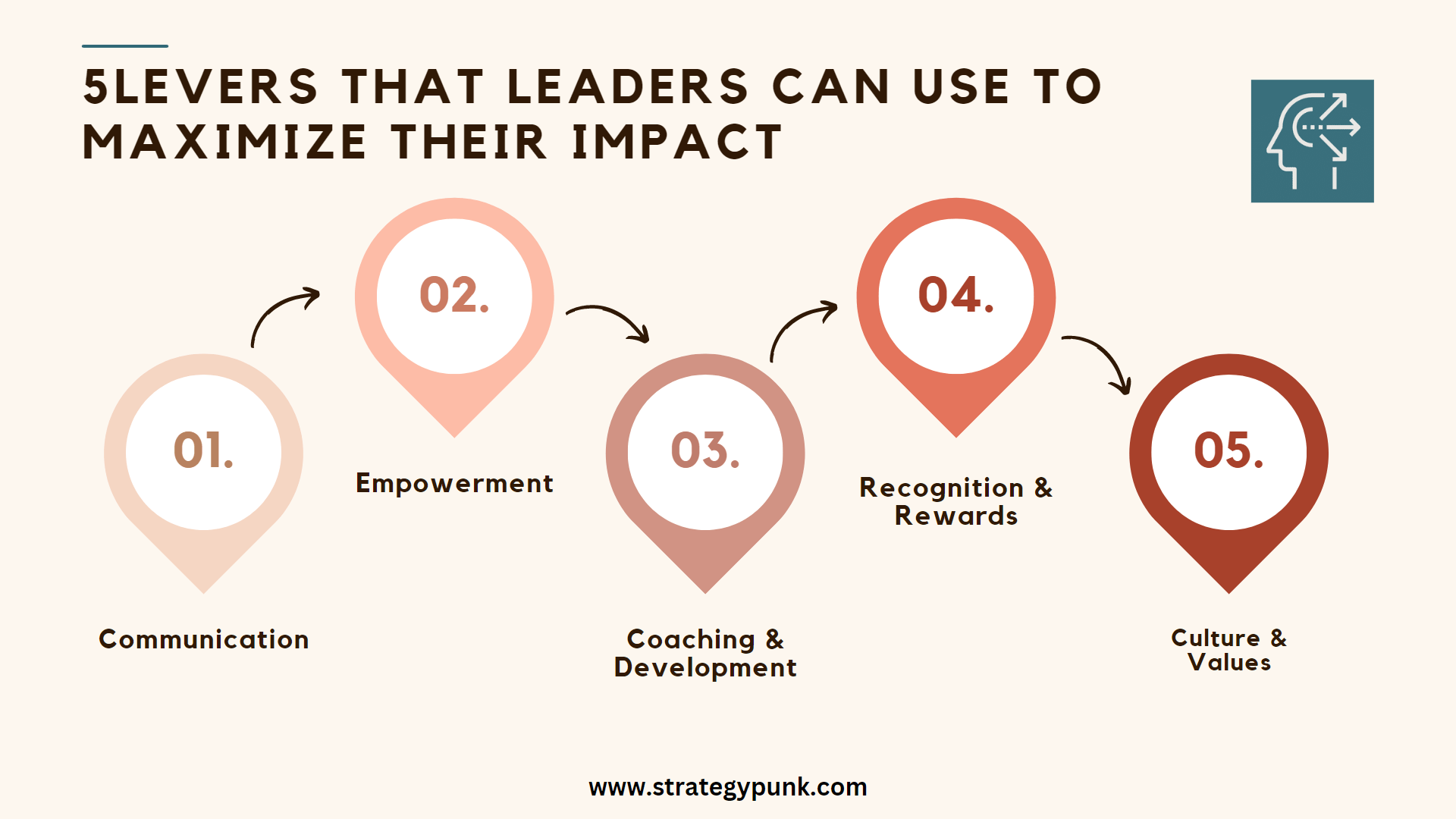 Leaders can create a work environment that fosters collaboration, innovation, and growth by effectively employing these levers – communication, empowerment, coaching and development, recognition and rewards, and culture and values.