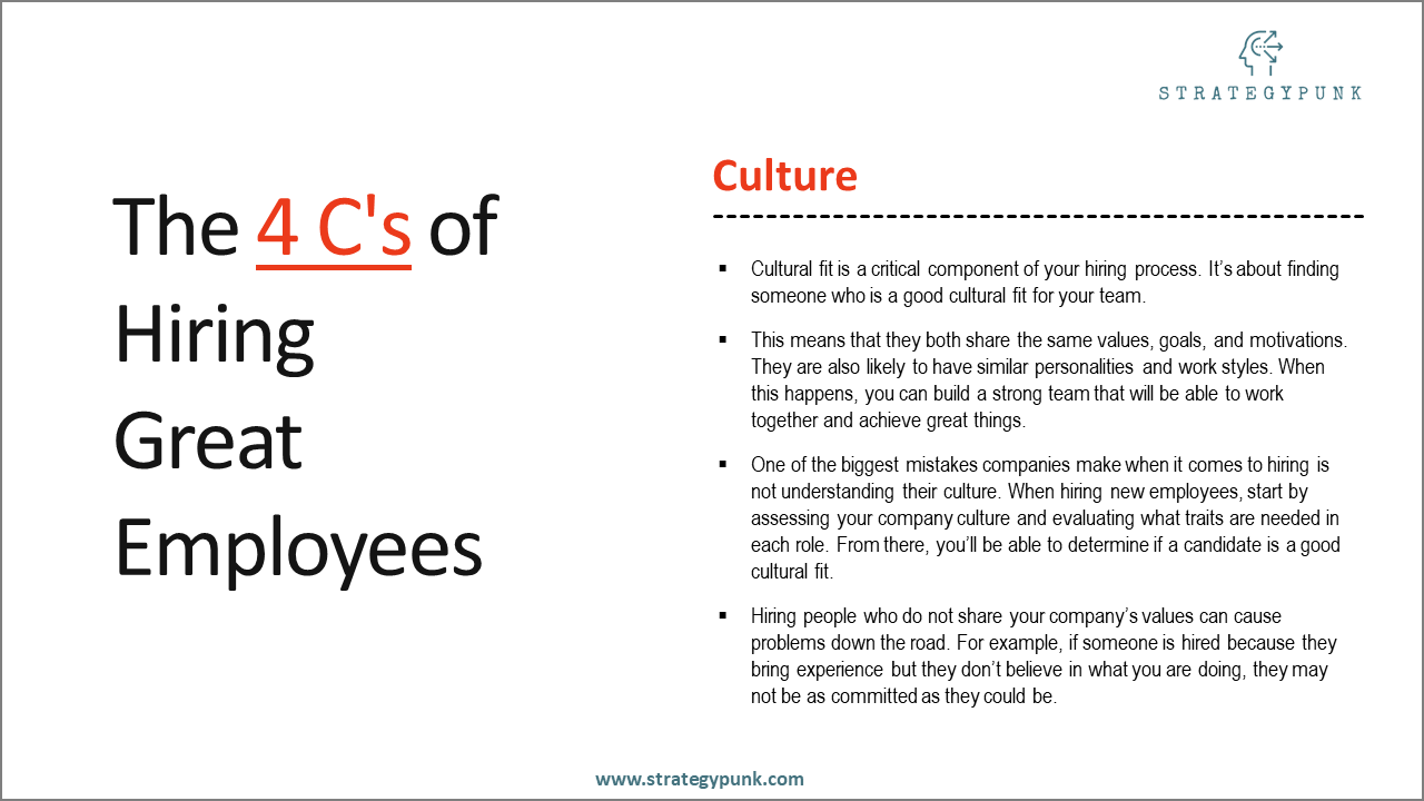 The 4 C's of Hiring: Guide and Free PowerPoint, Google Slides and PDF Template. Build a winning team with the right employees.