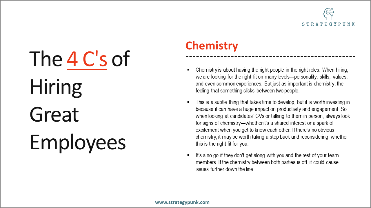 This is a subtle thing that takes time to develop, but it is worth investing in because it can significantly impact productivity and engagement. So, when looking at candidates' CVs or talking to them in person, always look for signs of chemistry—whether it's a shared interest or a spark of excitement when you get to know each other. If there's no obvious chemistry, it may be worth stepping back and reconsidering whether this is the right fit for you.