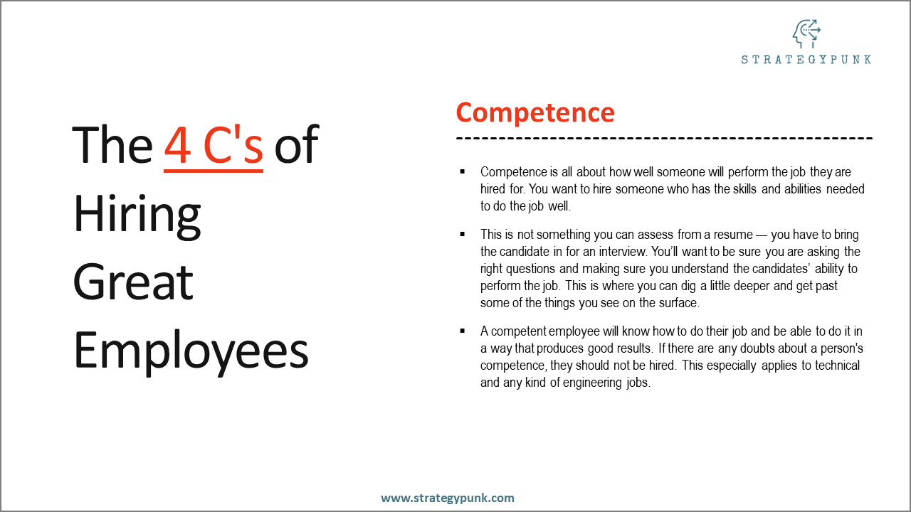 Finally, competence is all about how well someone will perform the job they are hired for. You want to hire someone with the skills and abilities to do the job well.