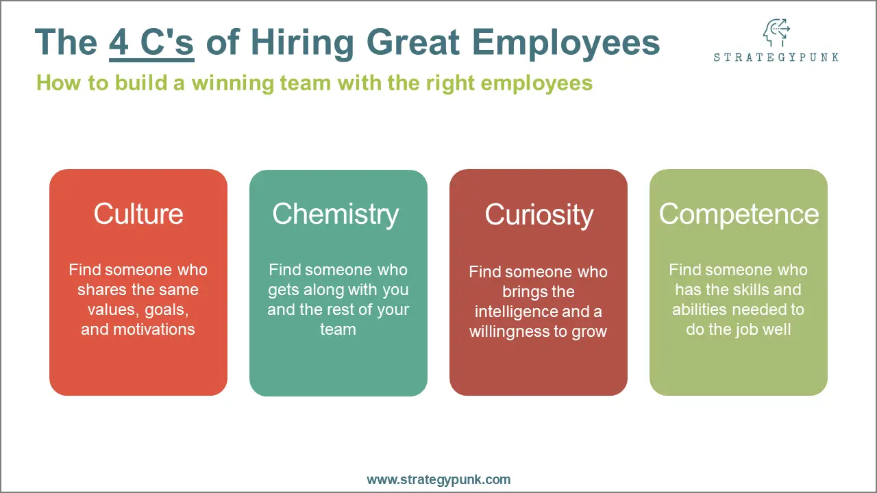 Ready to build a winning team with the right employees? Then, it’s time to consider the 4 C’s of Hiring: Culture, Chemistry, Curiosity, and Competence.