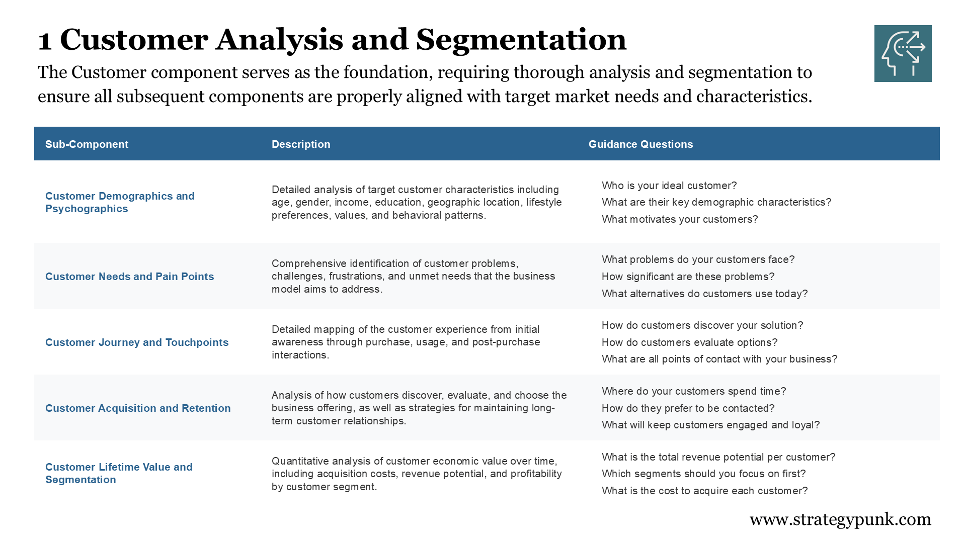 This isn't just "who are your customers?" This is deep customer analysis across five dimensions:
