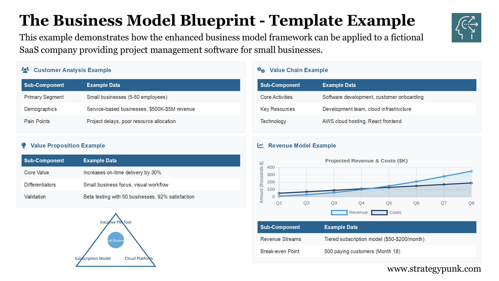 The Business Model Blueprint keeps the four core components but adds structure, guidance, and implementation tools. Instead of vague prompts, you get detailed worksheets. Instead of isolated thinking, you get systematic analysis.