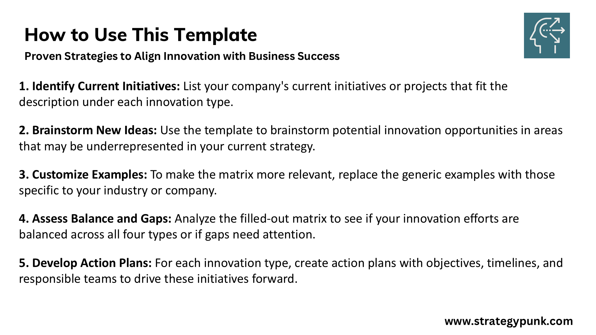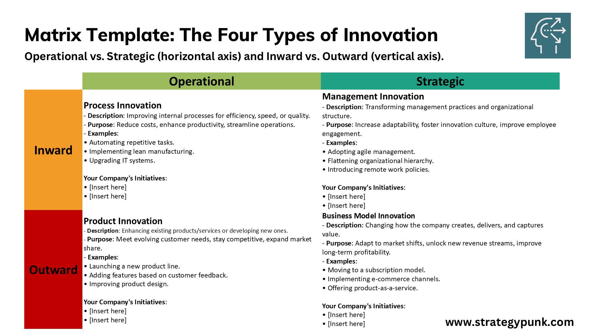 - Assess Balance and Gaps: Review the completed matrix to determine if your innovation efforts are balanced across all four types or if there are gaps that require attention.