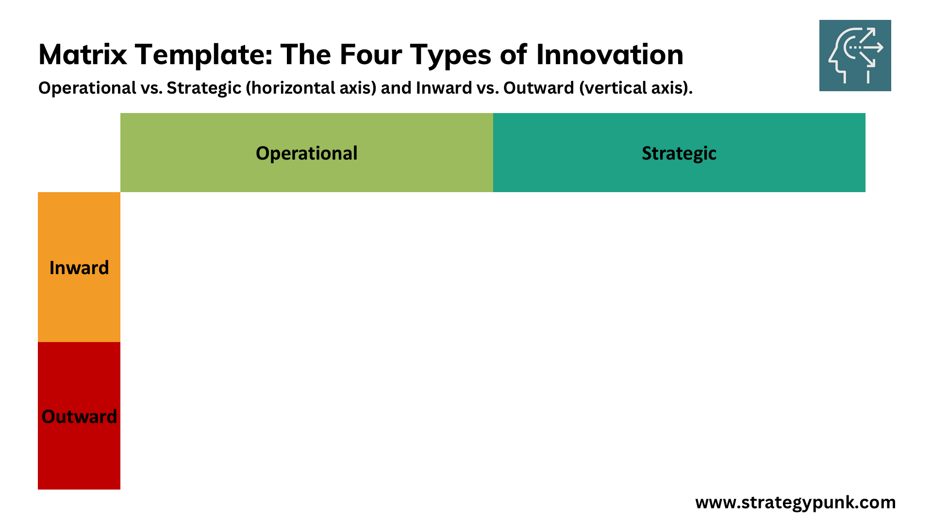 Below is a matrix template of the Four Types of Innovation model, organized along two axes: Operational vs. Strategic (horizontal axis) and Inward vs. Outward (vertical axis). This table is designed to be applied to any company and helps you identify and categorize your innovation initiatives.