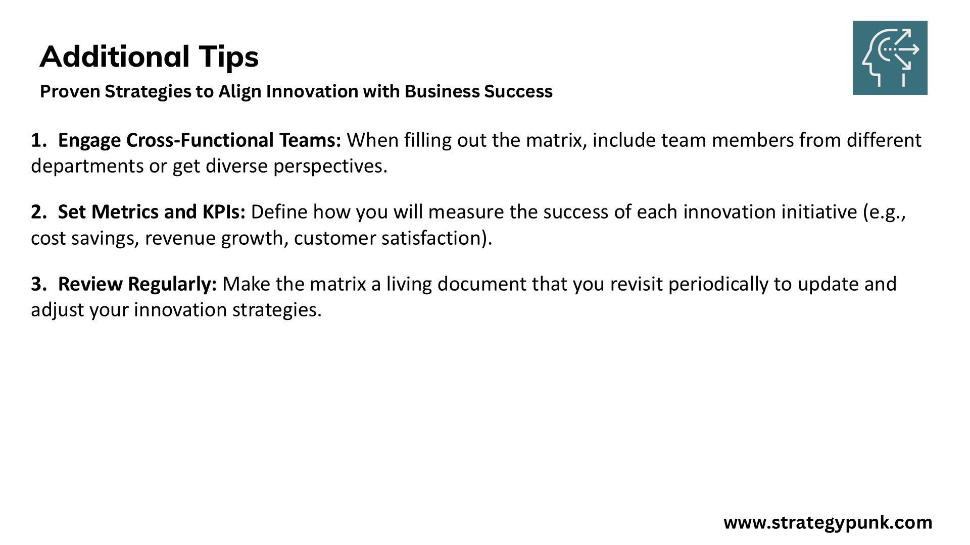 - Review Regularly: Make the matrix a living document that you revisit periodically to update and adjust your innovation strategies.