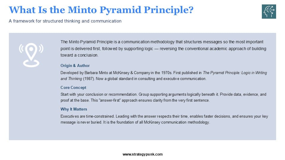 The Minto Pyramid Principle is one of the most practical communication frameworks ever developed. It forces clarity of thought before clarity of expression. It respects the audience's time. And it works in any format, from a one-line message to a full strategy presentation.