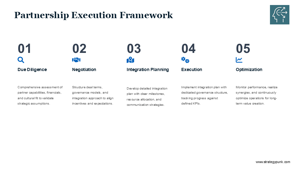 The critical insight here is that governance structures must be established early. Define decision rights, conflict resolution mechanisms, and performance metrics before you sign the deal—not after problems emerge.