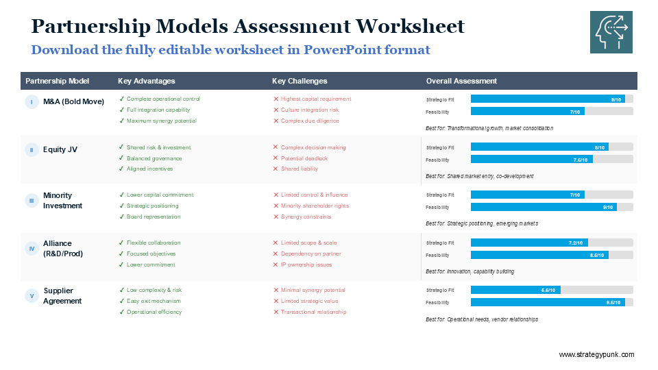 Partnership Models Assessment Worksheet (Editable PowerPoint) A ready-to-use worksheet for evaluating partnership opportunities across all five models. Includes pre-built scoring criteria for strategic fit, feasibility, key advantages, and key challenges. Fully editable so you can customize it for your organization's specific needs.
