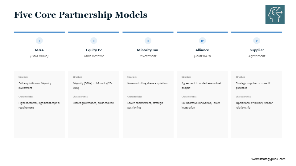 The framework identifies five distinct partnership structures, each suited to different strategic objectives: